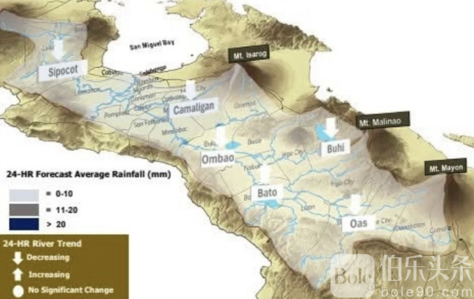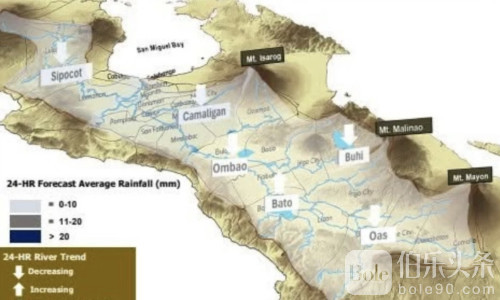 比科尔河流域洪水预报与警示中心(BRBFFWC)在当天18点的水文预报中指出,未来24小时降雨量可能达到11至20毫米,河水水位在卡马利甘(Camaligan)、翁保(Ombao)、巴托(Bato)、布希(Buhi)及周边地区有上升趋势,同时锡波科特(Sipocot)、圣米格尔湾(San Miguel Bay)和奥阿斯(Oas)等地也在密切监测之列。
