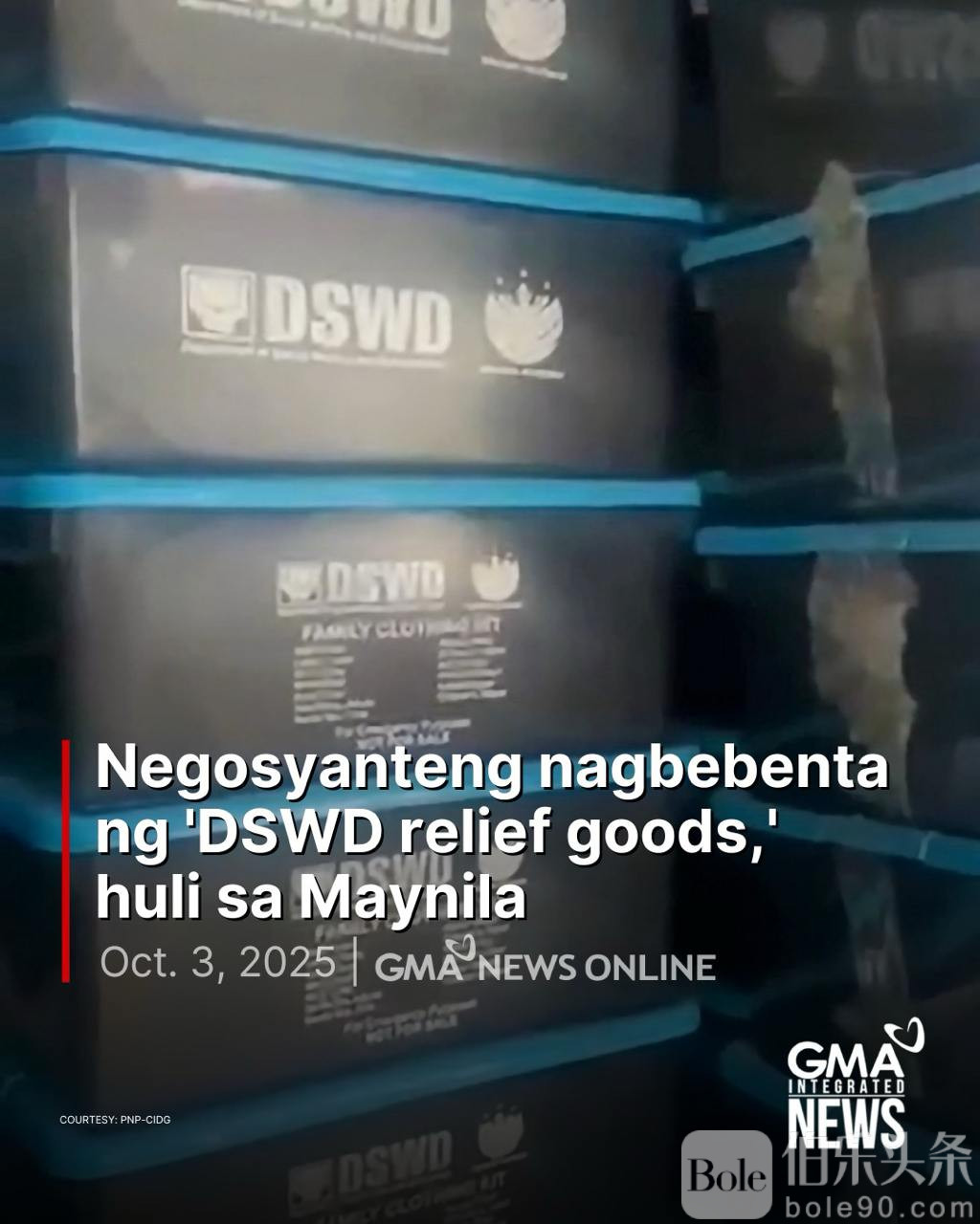 伯乐头条专讯:菲律宾马尼拉东都区一名商人因涉嫌非法出售印有社会福利与发展部(DSWD)标识的救援物资而被捕,这些物资原本是专供灾民的非食品救援包。