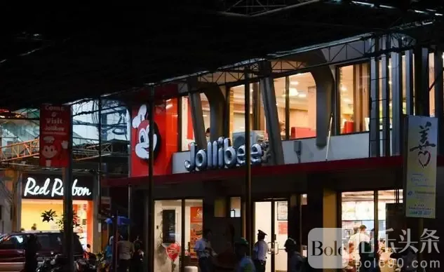 中国餐厅暖黄的灯光与Jollibee明快的红色招牌交相辉映。