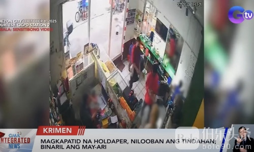 伯乐头条专讯:奎松市Katipunan商店发生惊险抢劫,一对兄妹闯入商店,抢走店主价值6万比索的珠宝,并开枪打伤店主右腿。事件发生于10月8日,嫌犯穿红T恤、戴口罩,迅速逃离现场。