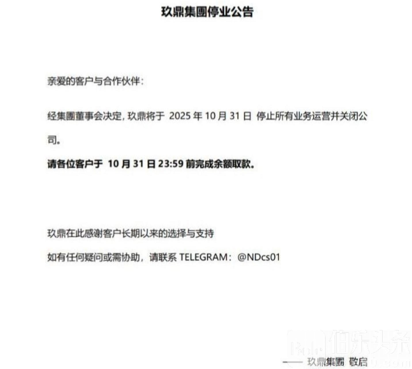 玖鼎集团发布停业公告,宣布10月31日起全面关门。公告同步提供Telegram客服通道,要求客户在截止日前取款。
