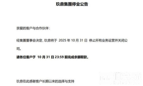 “经集团董事会决定,玖鼎将于2025年10月31日起正式停止所有业务运营,请客户在截止日前取回账户余额。”