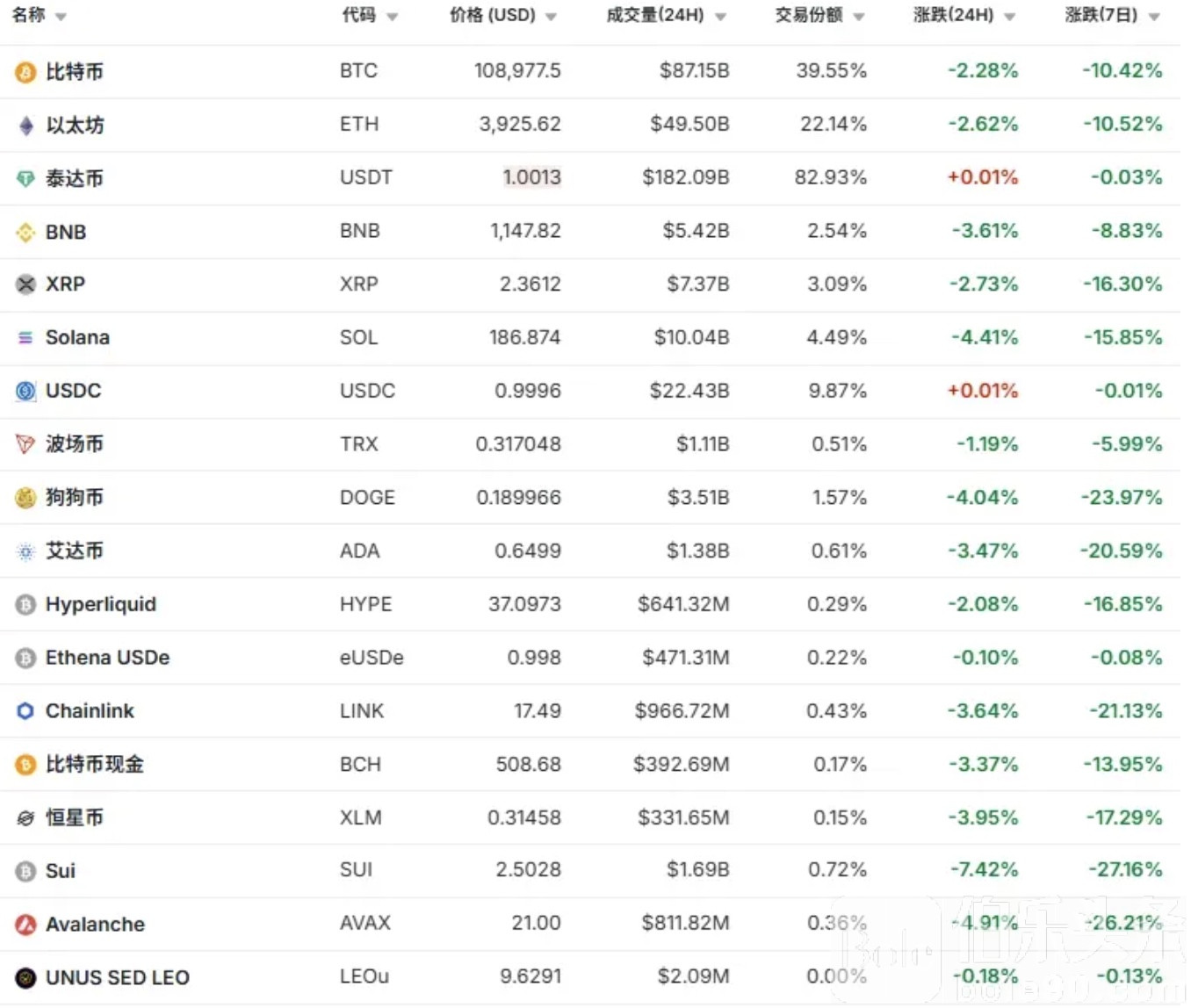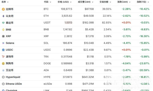 10月17日夜间,比特币价格从11.15万美元跌至10.75万美元,以太坊暴跌5%,Solana跌超4%。