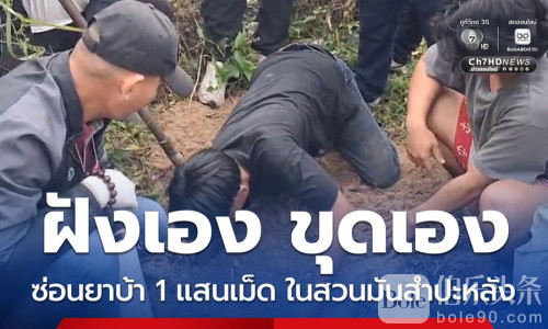 伯乐头条专讯:泰国警方在呵叻东北部实地掘出一批巨量毒品,藏匿手法堪称“自己埋、自己挖”。11月5日,四色菊府警方在当地木薯园中查获超过10万颗冰毒药丸,嫌犯被当场带往现场亲自挖出埋藏地点,场面震撼。