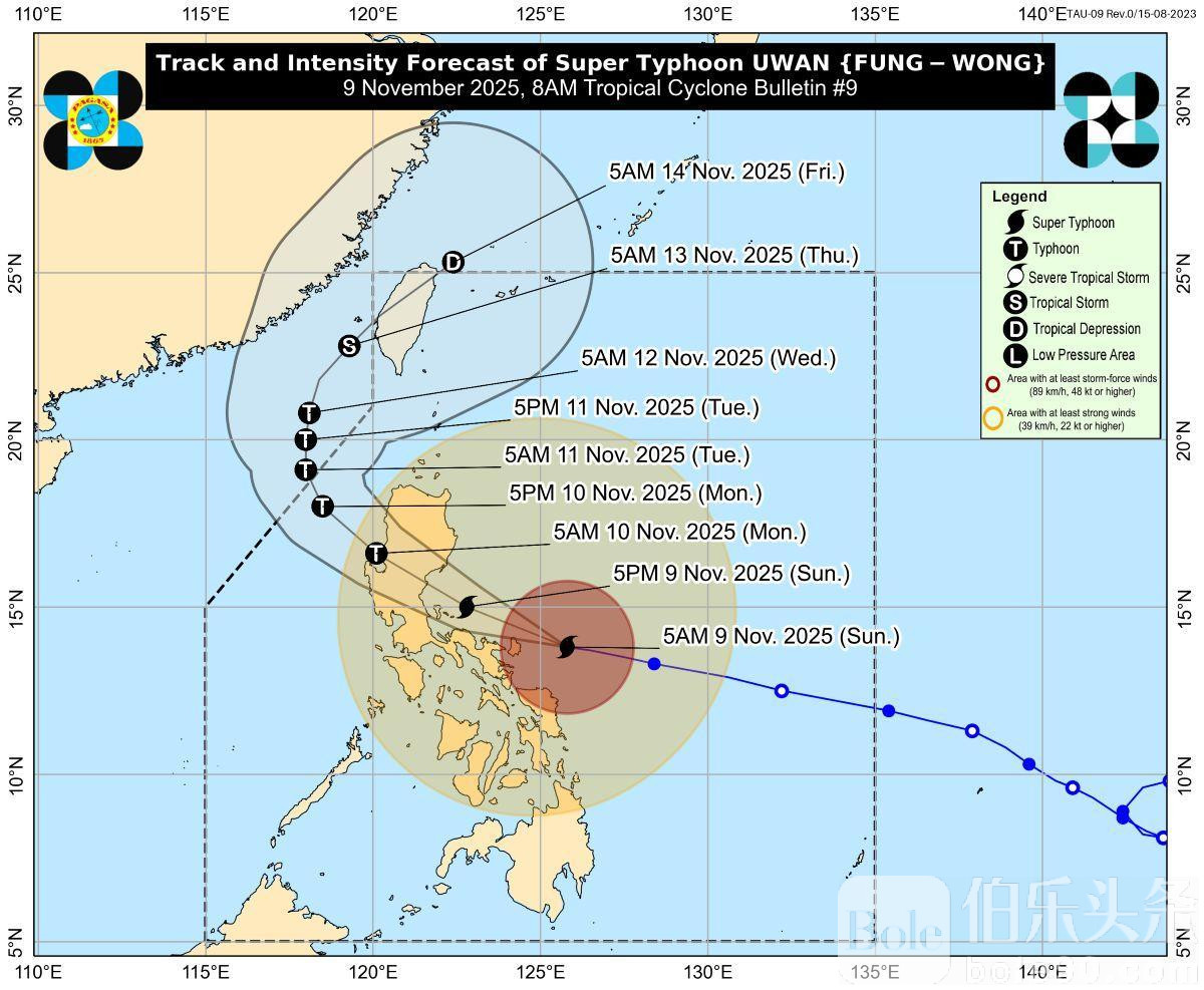 伯乐头条专讯:菲律宾气象局(PAGASA)今晨紧急发布警报——超强台风“乌万”(Uwann)全面升级,风力直逼历史极值!截至11月9日上午7时,台风中心位于卡坦端内斯省维拉克东北偏东约125公里处,中心最大风速高达每小时185公里,阵风达230公里,正以每小时25公里速度向西北偏西方向逼近吕宋岛。