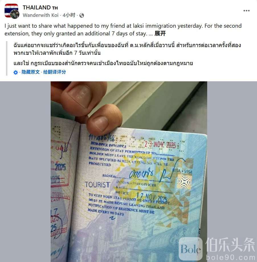 伯乐头条专讯:近日,有网友在曼谷廊曼机场附近反映,其友人在 Lak Si 移民局申请第二次续签时,仅获批 7 天停留,引发外界关注。此情况与泰国移民局自 11 月 12 日起启动的“四项严格管控措施”直接相关,重点针对滥用免签、频繁短进短出、借旅游签长期滞留等行为加大审查力度。泰移民局强调,此轮措施并非针对普通旅客,但若旅客存在以下情况,将被重点审查,续签天数减少甚至被拒签、拒入境或遣返: