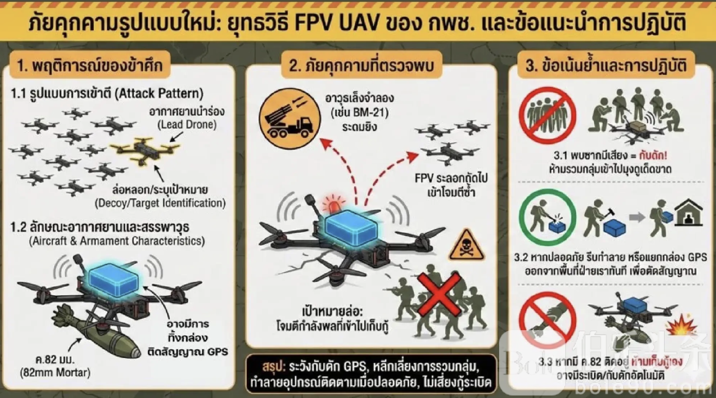 伯乐头条专讯:泰国第二军区发布最新警告,称柬埔寨军队在泰柬边境使用“自杀式无人机”与火箭弹对泰方阵地实施精准袭击。泰国第二军区近日向前线官兵发出特别警示图,强调柬埔寨军队疑似利用第一人称视角(FPV)无人机执行新型“自杀式袭击”与目标定位任务,并提醒泰军务必避免靠近坠落无人机,以防遭遇诱爆或遭远程火力锁定。