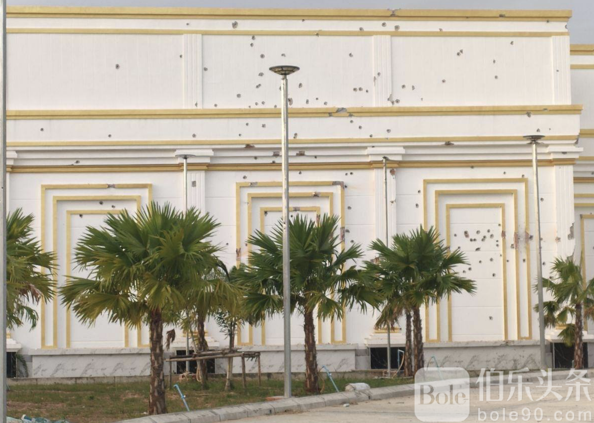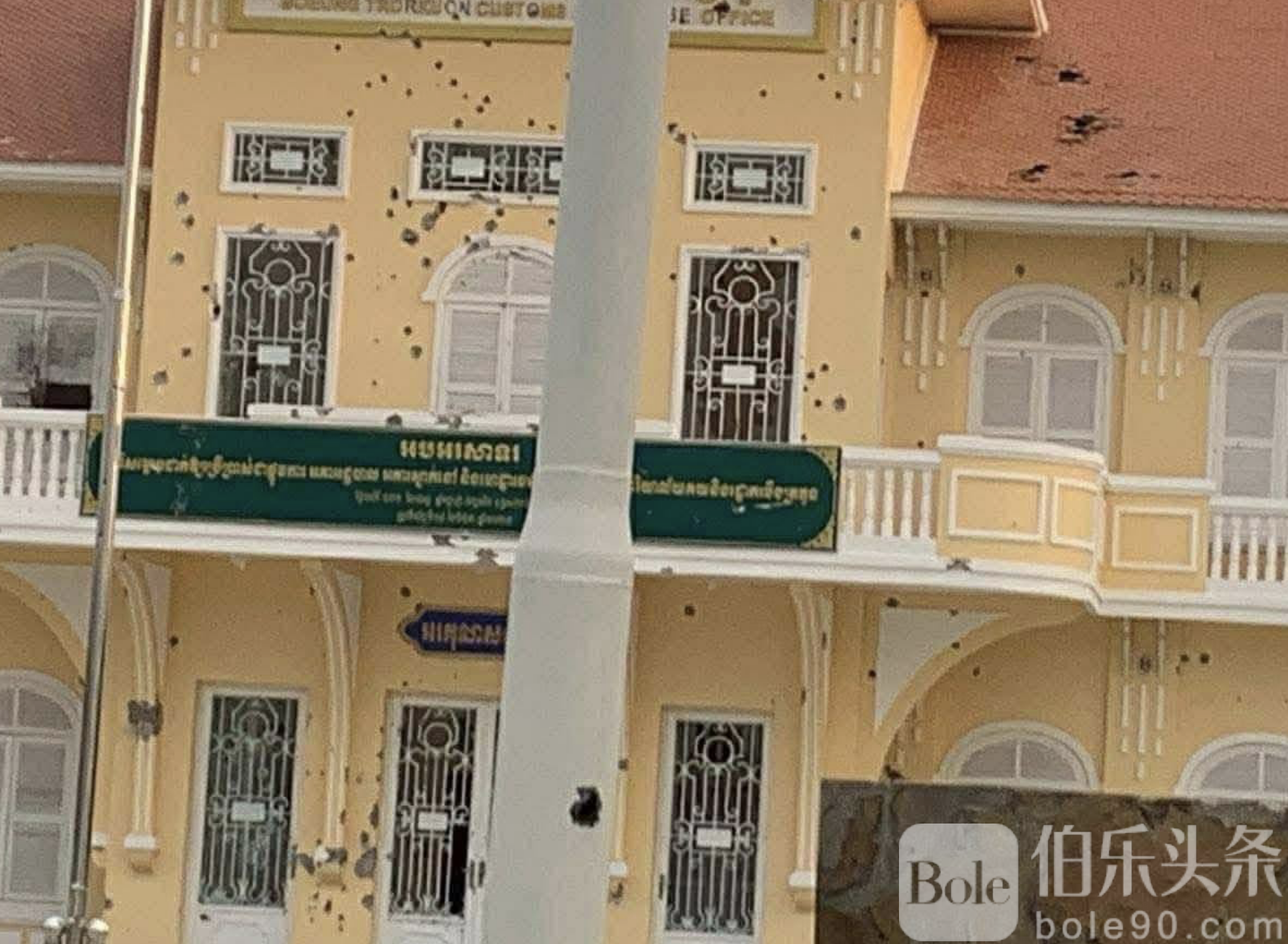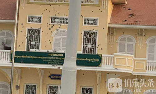伯乐头条专讯:今晨柬泰边境再度紧张升级,柬埔寨菩萨省韦文县莫达地区一家赌场突遭泰军炮火轰击,现场建筑外墙被炮弹击中,玻璃碎裂、墙体破损,赌场内部一片狼藉。