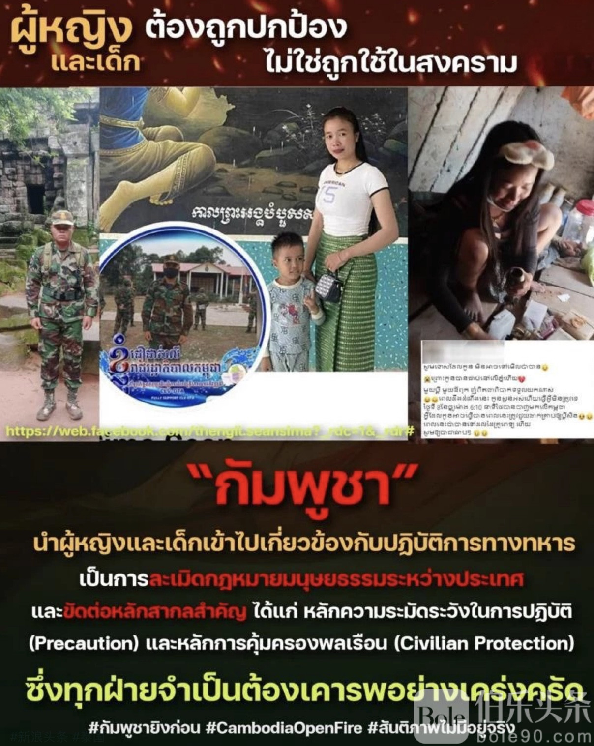 泰国第二军区随后在其脸书页面发表声明,语气强烈,直指此行为触犯国际底线。“妇女和儿童必须被保护,而不是被利用于战争!”声明写道,并强调柬埔寨在军事行动中使用妇女儿童,涉嫌违反国际人道主义法及多项关键原则,包括预防原则与民事保护原则。