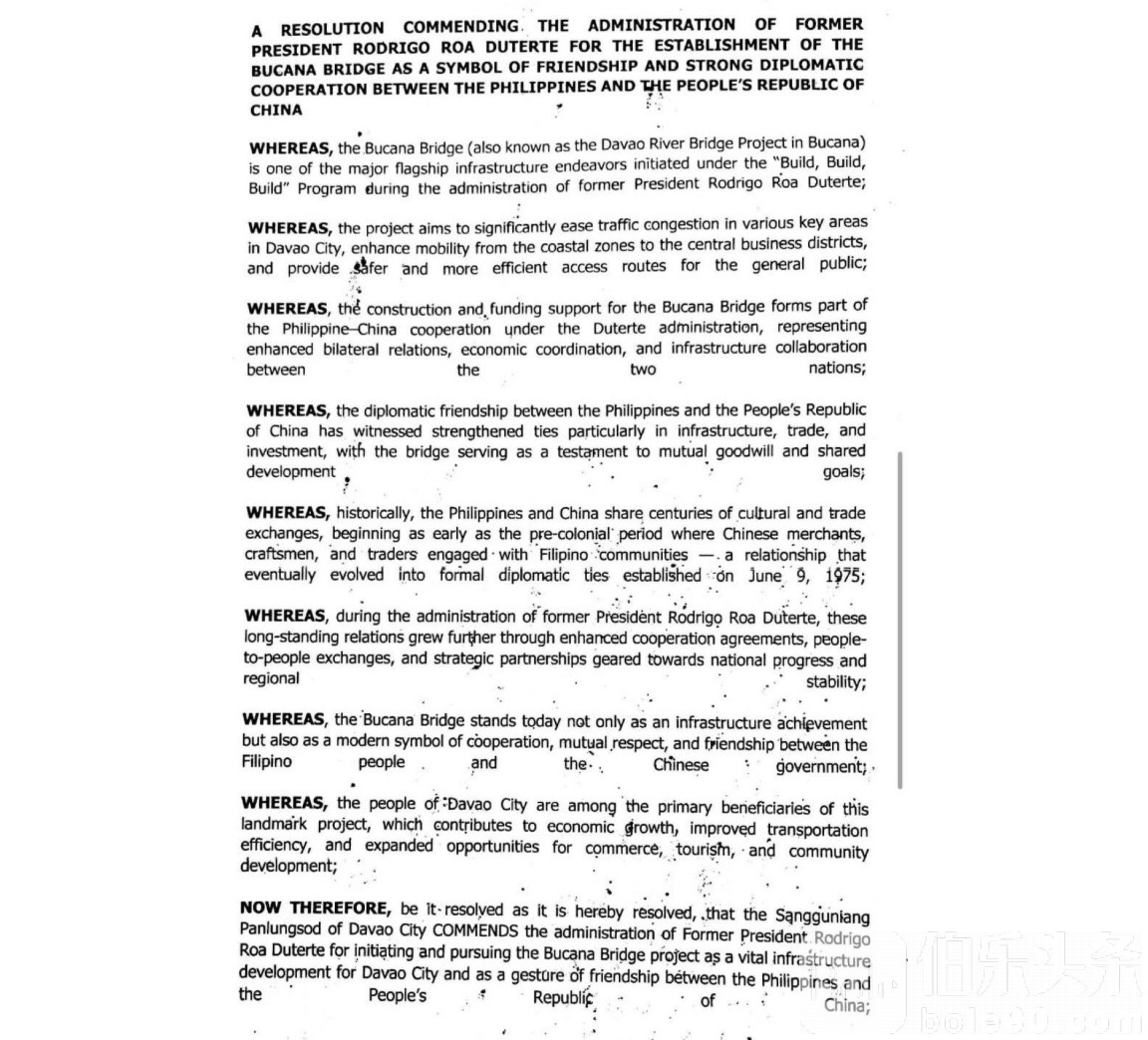 伯乐头条专讯:达沃市议会近日通过决议,公开表彰前总统杜特尔特政府以及中国政府在 Bucana 桥建设上的贡献。议会财务委员会主席丹尼洛·达杨希朗在特别发言中指出,这座桥不仅将缓解交通拥堵,还能带动当地经济发展,并进一步巩固中菲两国的外交与经济合作关系。