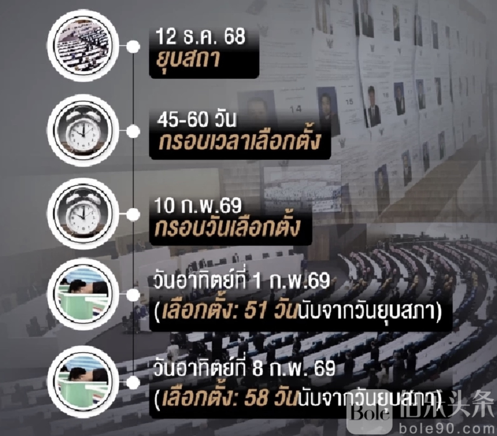 伯乐头条专讯:泰国国王御准解散国会后,新一轮全国大选程序正式进入倒计时。随着法定流程全面启动,未来两个月泰国政坛的节奏可谓一刻都停不下来:选委会最晚将在 12 月 17 日敲定投票日,而选民最早可能在 2026 年 2 月 1 日走进投票站,选出新一届国家领导人。