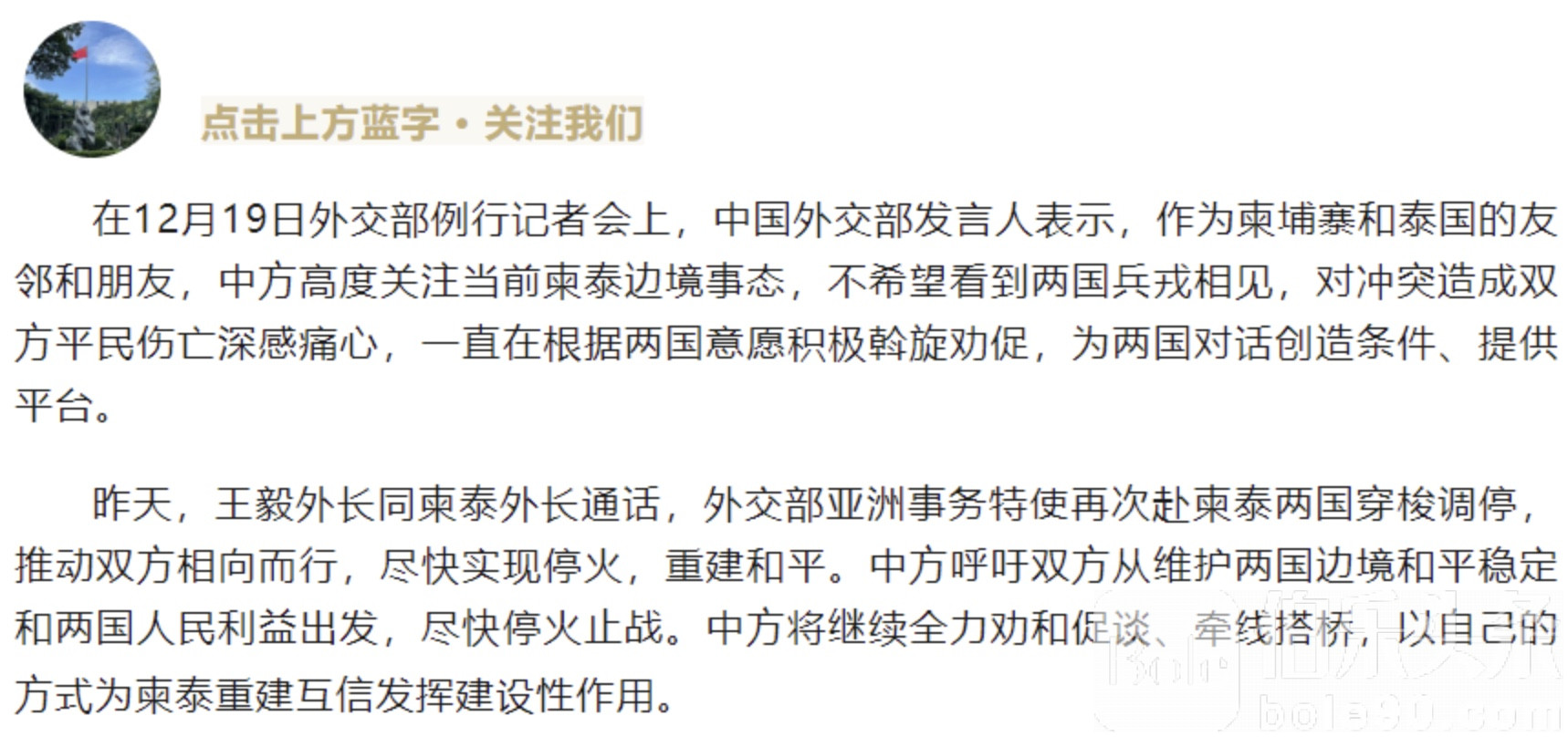 在12月19日举行的外交部例行记者会上,发言人表示,中方作为柬埔寨和泰国的友邻与朋友,高度关注近期边境事态发展。中方不愿看到局势升级,更不希望冲突扩大至兵戎相见,对由此造成的平民伤亡深感痛心。基于两国意愿,中方一直在以务实方式积极劝和促谈,为双方对话创造条件、搭建平台。