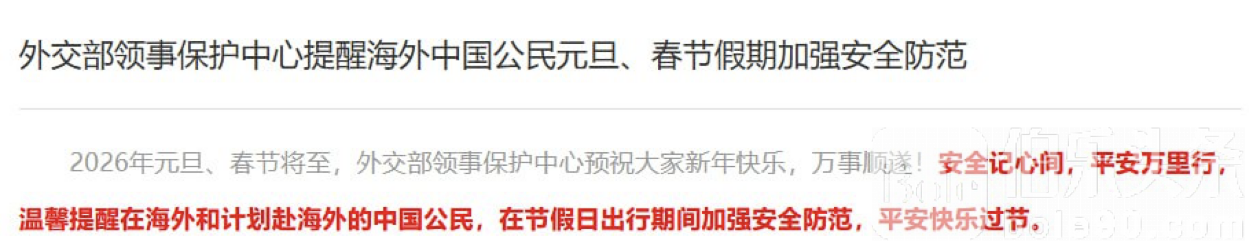 伯乐头条专讯:2026年元旦与春节将至,外交部领事保护中心温馨提醒海外及计划赴海外的中国公民,在节假日出行期间务必加强安全防范,确保平安顺利过节。