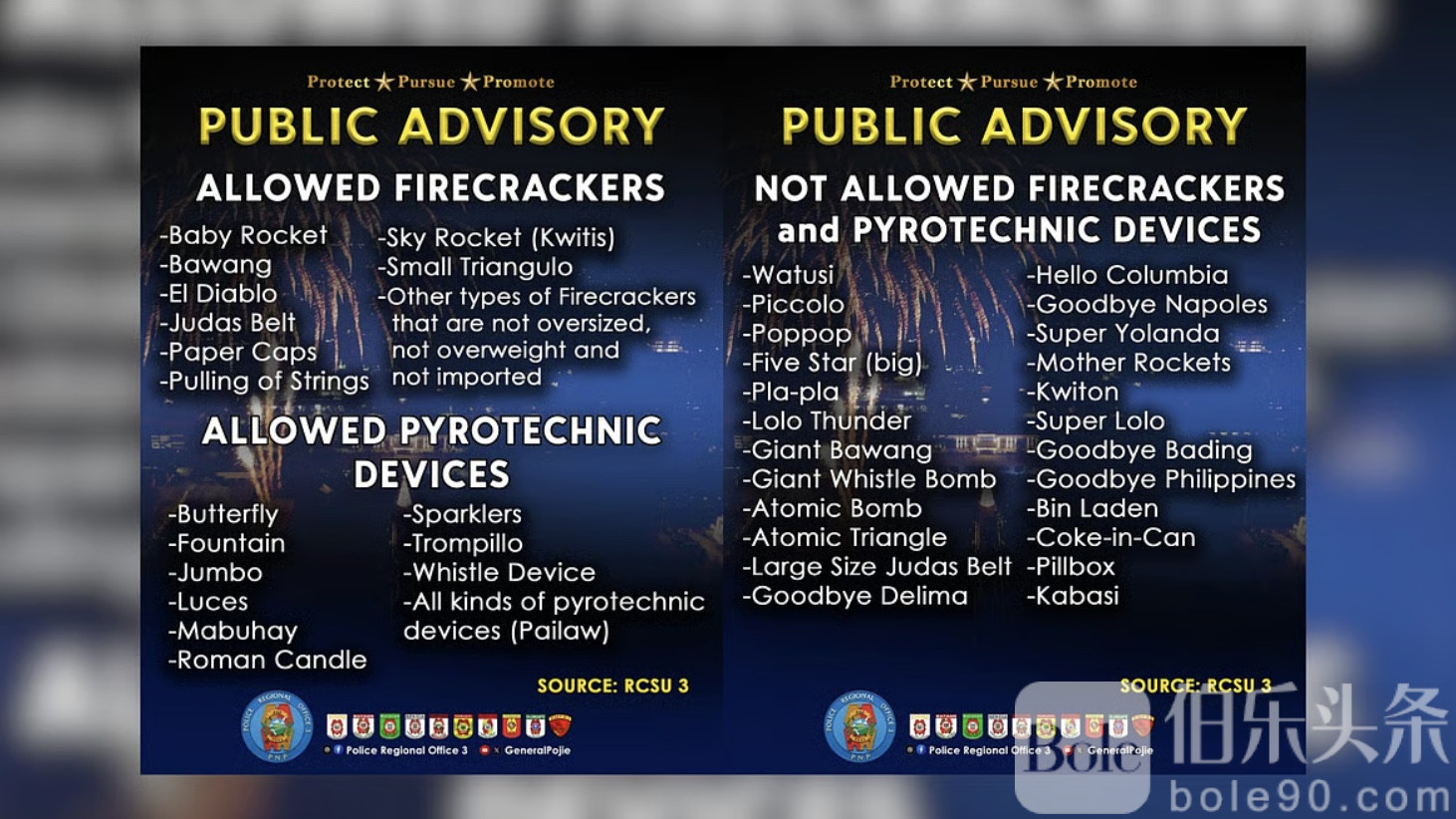 伯乐头条专讯:菲律宾中吕宋地区警方近日发布节日烟花爆竹使用公告,提醒民众节日期间务必安全、合法燃放。警方通过区域民防安全单位(RCSU-3)指出,此举属于“Ligtas Paskuhan”(安全圣诞)宣传活动的一部分,旨在确保假期庆祝秩序井然、避免伤害事故发生。
