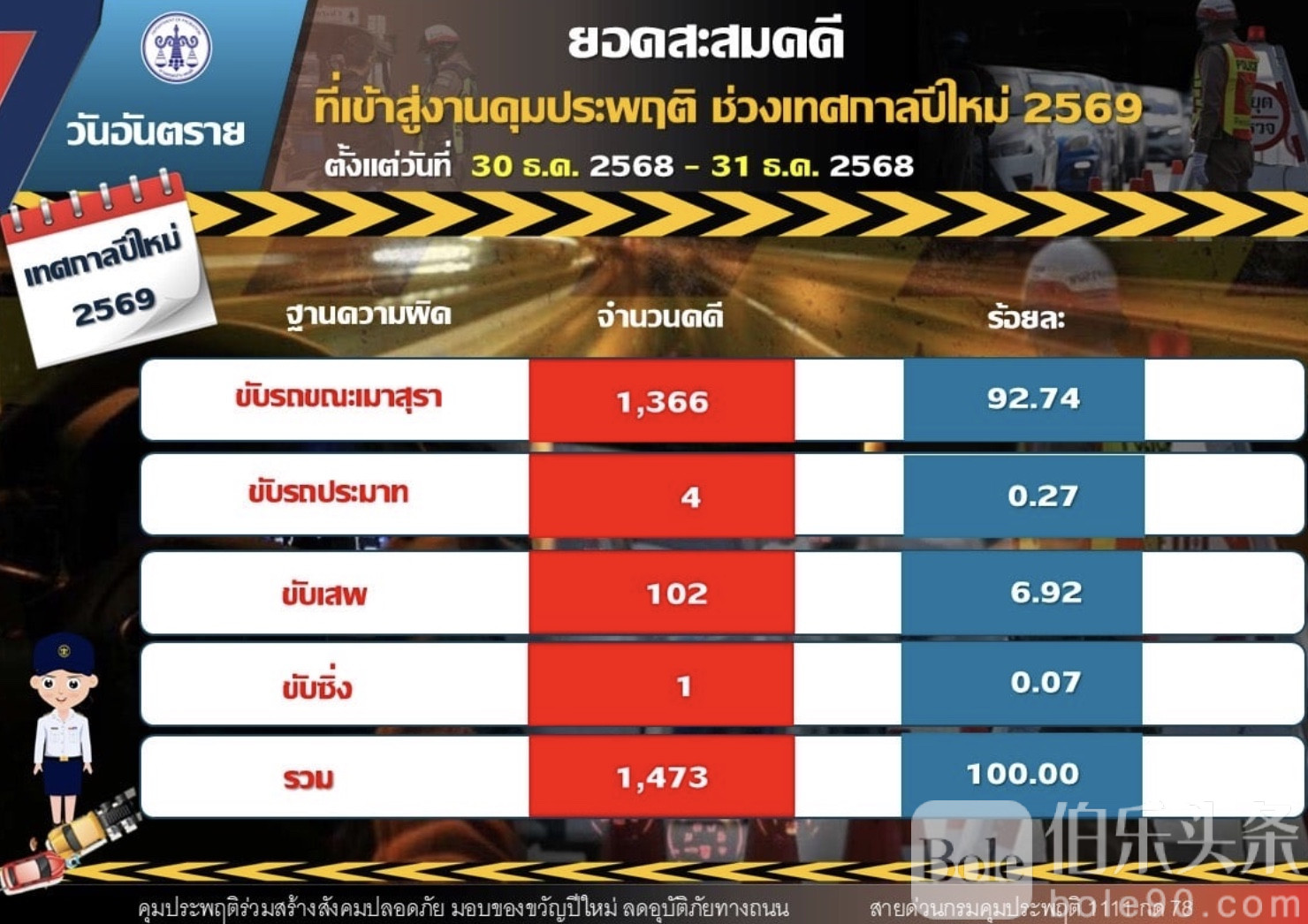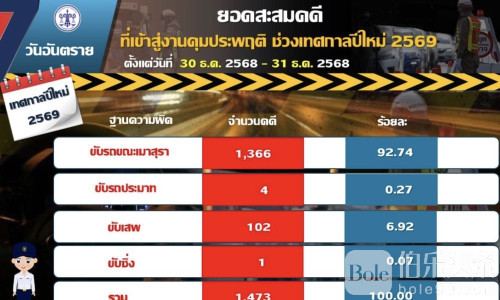 伯乐头条专讯:新年前夕,泰国道路酒驾情况仍然令人关注。根据1月1日公布的数据,12月30日至31日两天内,全国累计交通违法案件达1,473起,其中酒驾高达1,366起,占比超过九成,其余涉及危险驾驶、毒驾及超速驾驶等案件。