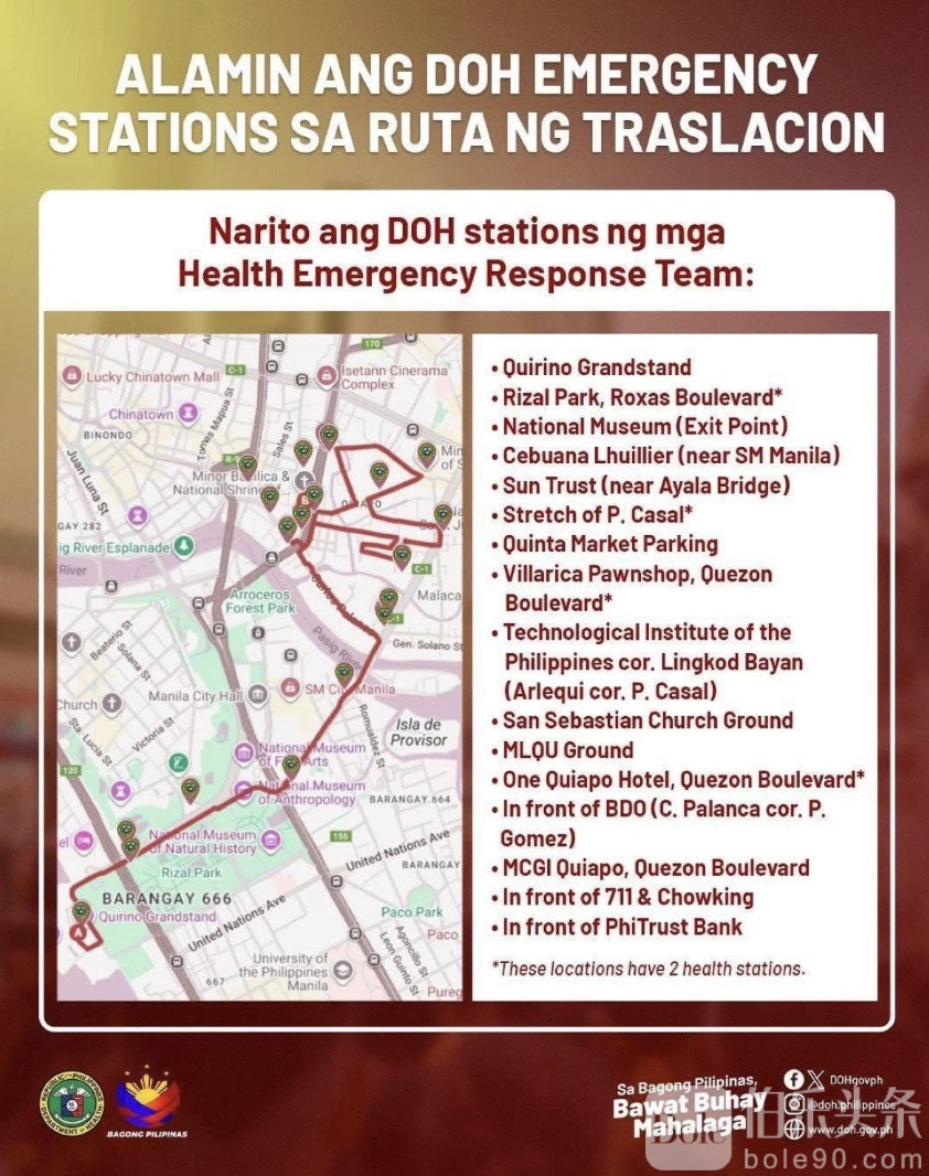 伯乐头条专讯:为应对2026年黑耶稣(耶稣拿撒勒人)圣像巡游(Traslacion)期间可能出现的各类突发健康状况,菲律宾卫生部(DOH)已提前在巡游沿线部署多处应急医疗响应站,力求在这场动辄吸引数百万信众参与的年度盛事中,把风险降到最低。