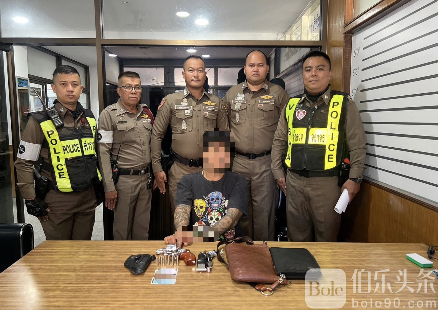 伯乐头条专讯:泰国曼谷警方7日在维帕瓦迪—兰实路展开例行巡查时,成功拦截一辆行迹可疑的皮卡车,当场查获一把史密斯—威森(Smith & Wesson).38口径左轮手枪、6发子弹及一把随身刀具,嫌疑人为一名39岁男子,目前已依法移送调查。