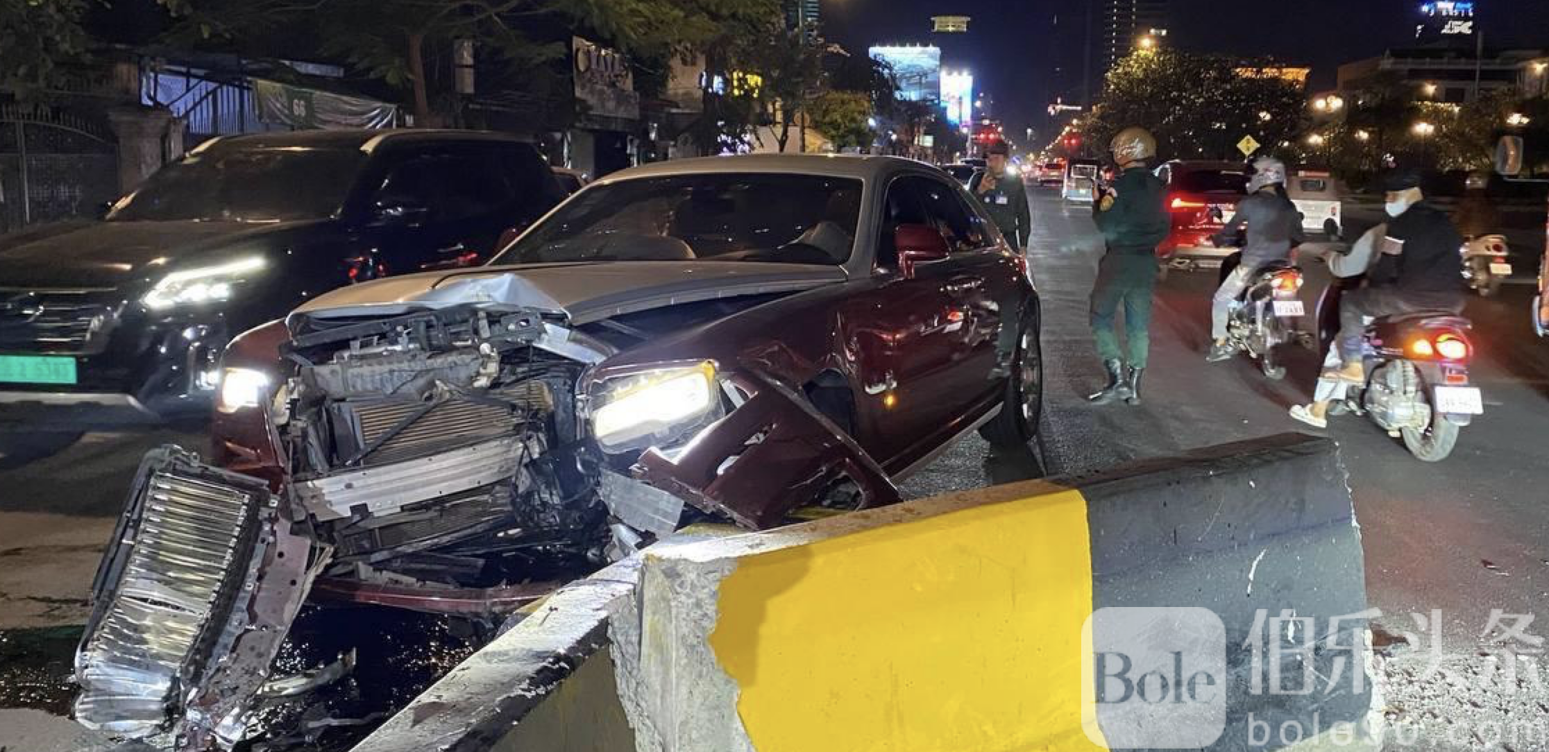 伯乐头条专讯:柬埔寨金边市隆边区1月11日晚间发生一起引发关注的豪车交通事故,一辆由中国籍男子驾驶的劳斯莱斯轿车在深夜高速行驶途中失控,猛烈撞上道路中央石制隔离护栏,车辆及公共设施均遭到严重损毁。