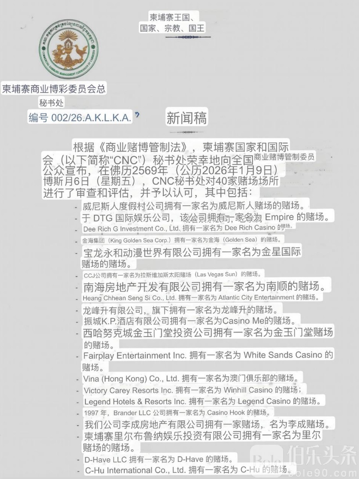 伯乐头条专讯:柬埔寨商业博彩委员会(CCGC)总秘书处近日正式对外发布公告,公布目前经国家审查并予以认可的合法赌场名单。官方明确强调:凡未出现在该名单中的园区赌场或博彩场所,均不具备合法经营资格,将成为下一步重点打击和清理对象。