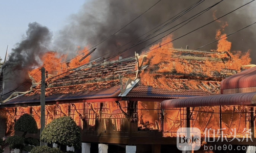 伯乐头条专讯:2026年1月13日下午16时,泰国洛披府塔寇寺突发严重火灾,火势猛烈,法堂瞬间被大火吞噬,现场浓烟滚滚,可远距离清晰可见,造成寺内僧侣和周边民众惊慌失措。