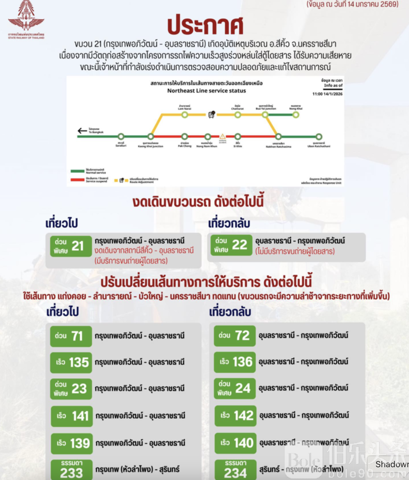 泰国铁路局已提醒当天原计划乘坐受影响线路的乘客,可全额退票,并建议出行前务必通过官方渠道确认列车时刻及线路调整情况。乘客可通过铁路局官网或拨打服务热线1690获取最新信息。