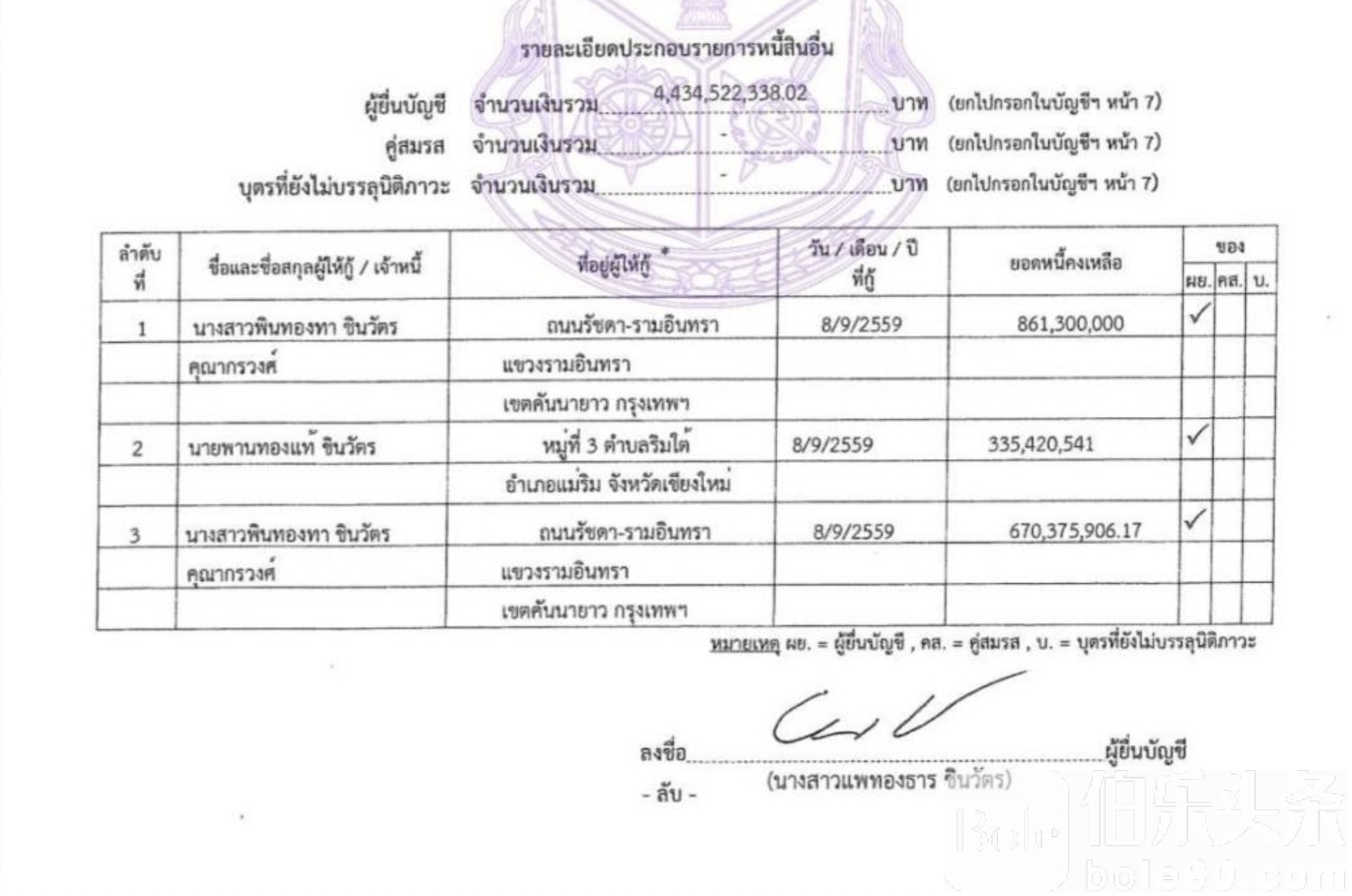 申报资料显示,佩通坦与其丈夫皮托及两名子女名下合并资产总额高达 113.21亿泰铢,同时背负 44.41亿泰铢 的负债。换句话说,这是一份“身家与债务并存”的财务版图。