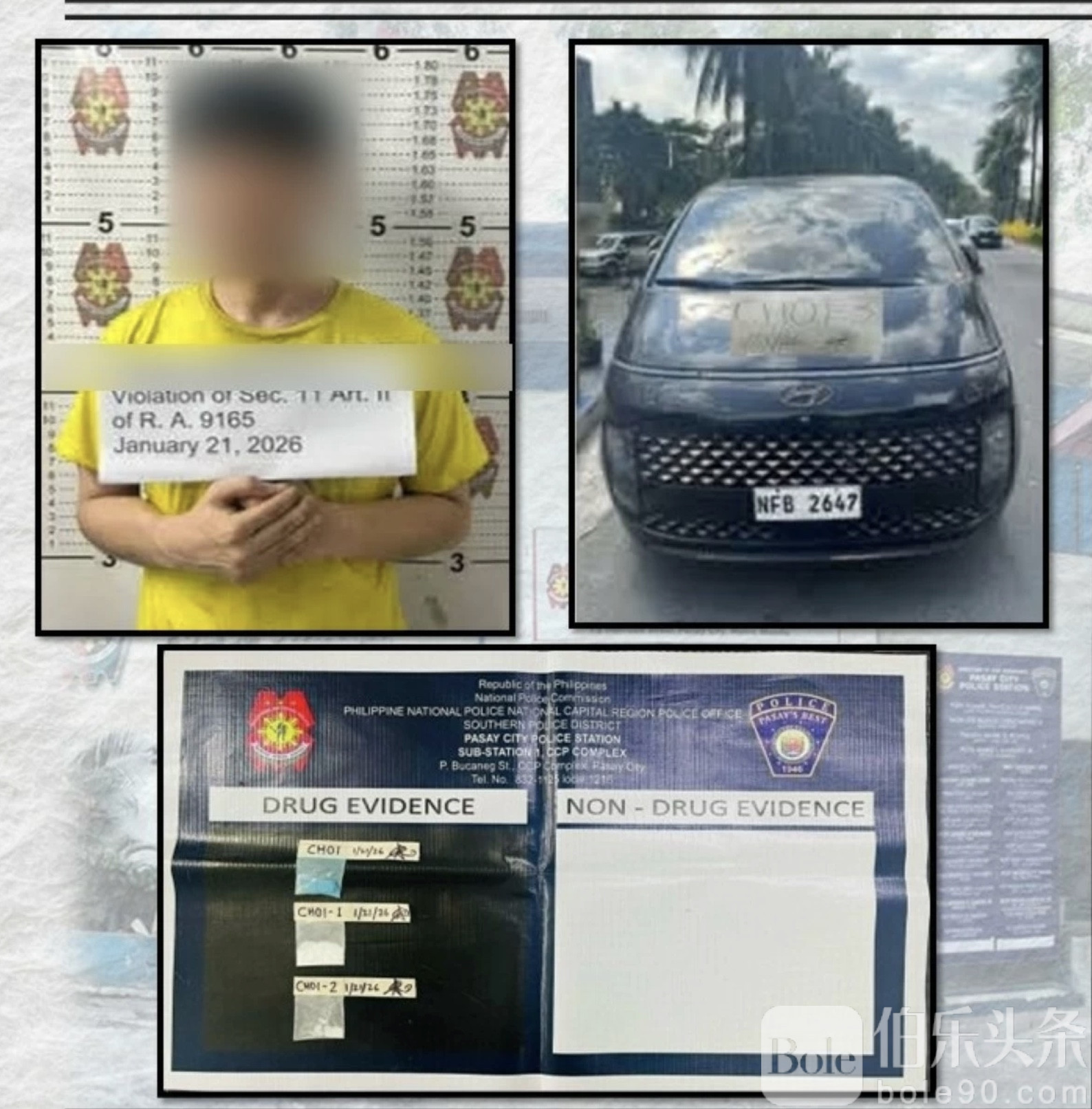 伯乐头条专讯: 菲律宾帕赛市警方21日下午在一次例行巡逻中逮捕了一名涉嫌非法持有毒品的韩国男子。嫌犯“Choi”,40岁,赌场工作人员,住在Roxas大道2021 Residences。事件起因是一场疑似车辆碰撞引发的争执,当警方靠近现场时,Choi从其Hyundai Staria车辆中下车,并试图偷偷丢弃几包透明小袋,引起警方怀疑。