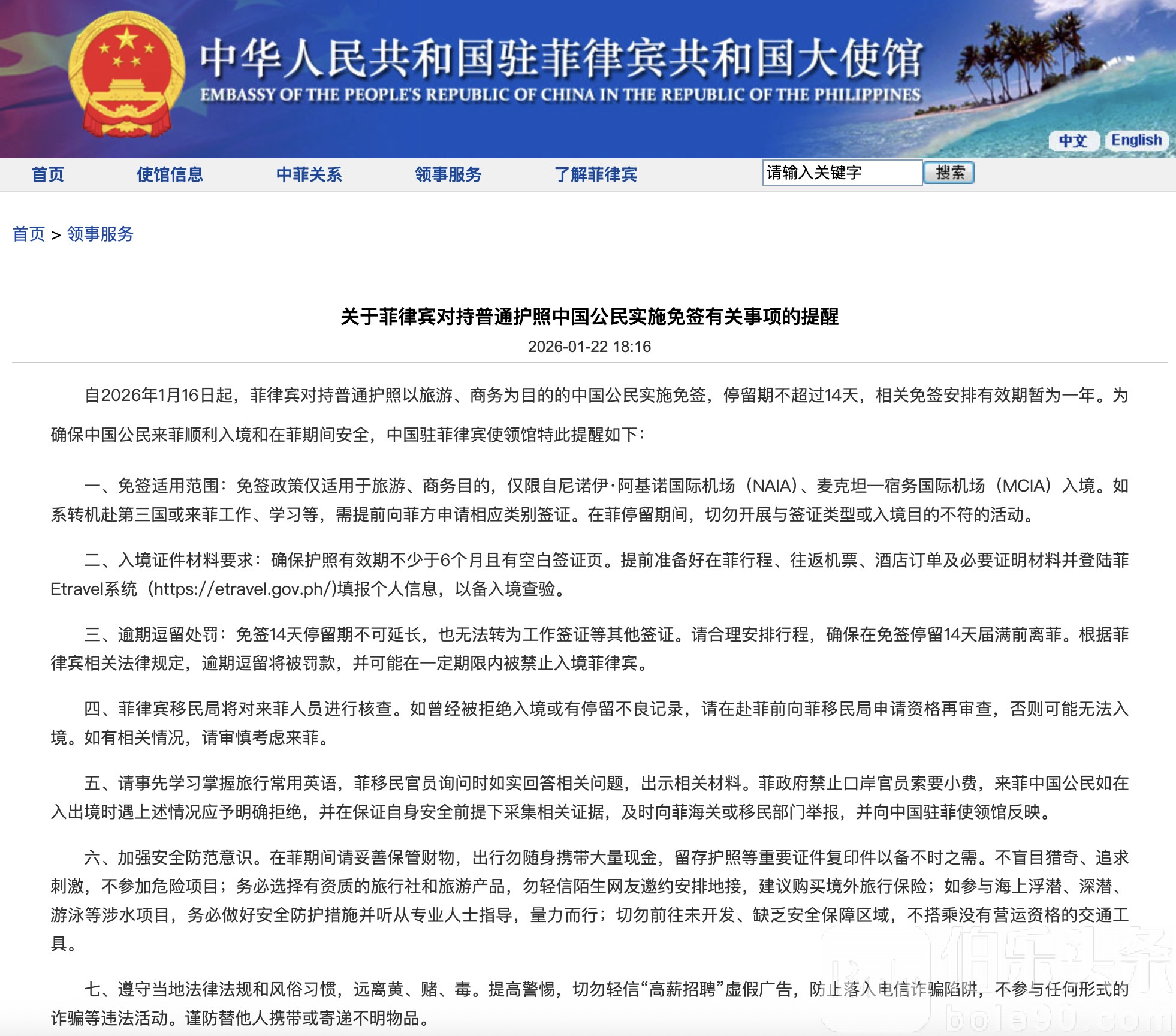 伯乐头条专讯:自2026年1月16日起,菲律宾正式对持普通护照、以旅游或商务为目的的中国公民实施免签入境政策,单次停留不超过14天,相关安排暂定有效期为一年。为帮助中国公民顺利入境、安心出行,中国驻菲律宾使领馆于1月22日发布重要提醒,涵盖入境范围、证件要求、安全防范等多项关键事项。