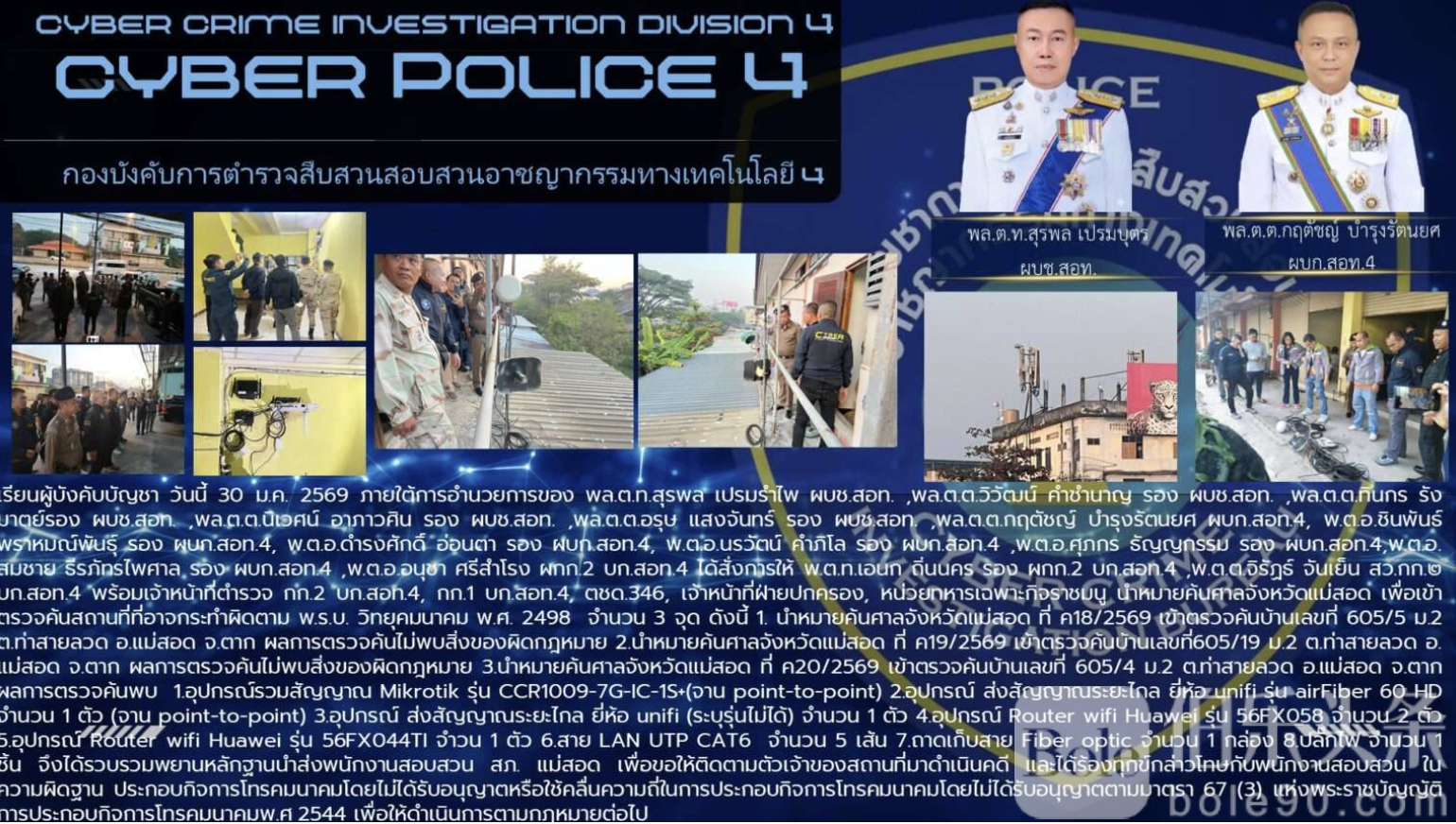 行动于1月30清晨7时左右展开,由泰国网络警察司令部第四行动组第二分队携手国家广播与电信委员会人员,在来塞瓦区一带同步执行三张搜查令。执法人员重点锁定位于门牌605-4号的一处民宅,该地点被怀疑是非法网络信号的集散与中转站。