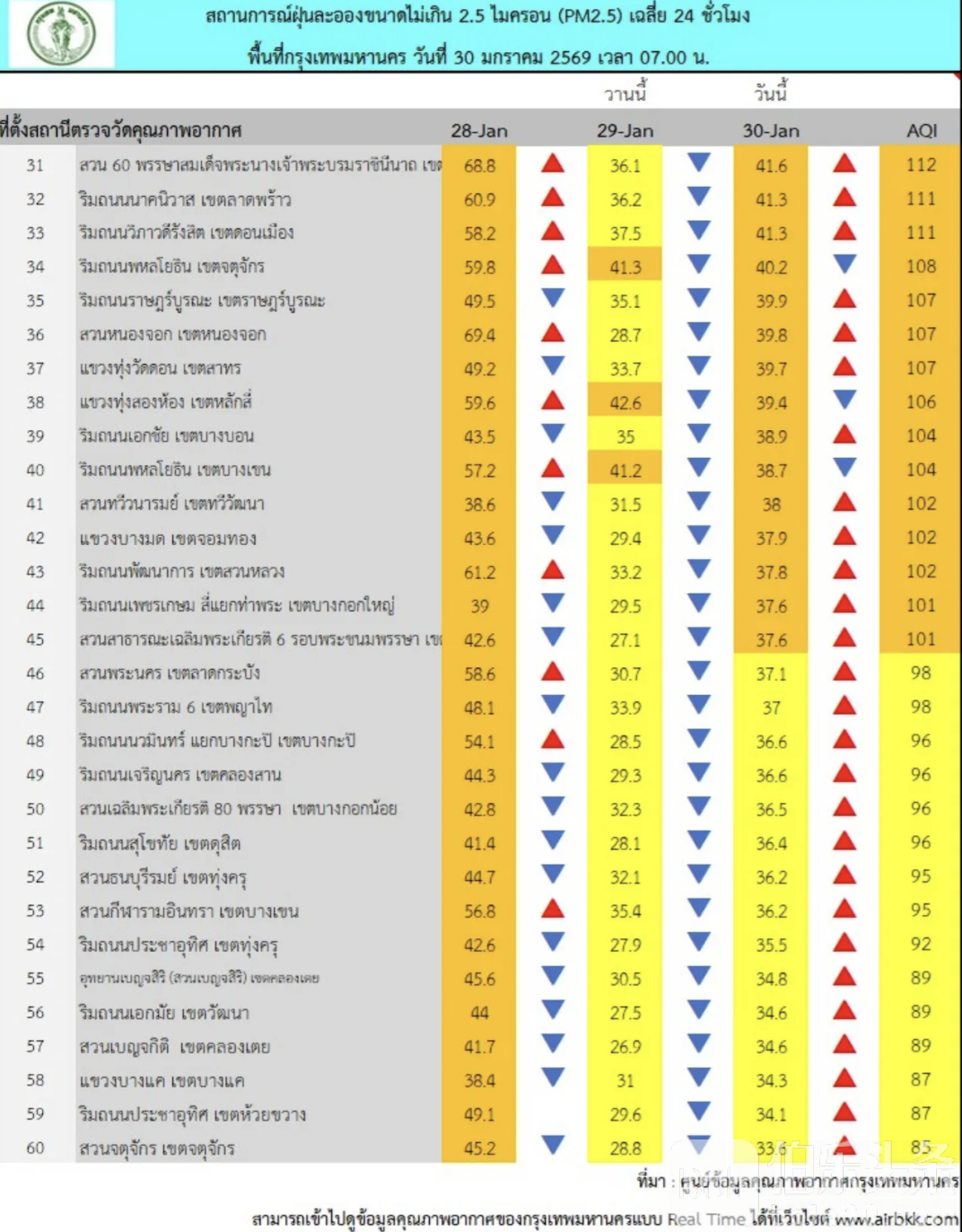 伯乐头条专讯:泰国曼谷空气污染加重,1月30日清晨监测显示,PM2.5浓度普遍超标,达到橙色警戒水平,对健康开始产生影响。据曼谷空气质量监测中心报告,截至上午7点,24小时平均PM2.5浓度在31.4–54.7微克/立方米之间(标准不超过37.5微克/立方米),共45个地区被列为空气质量橙色警示区。