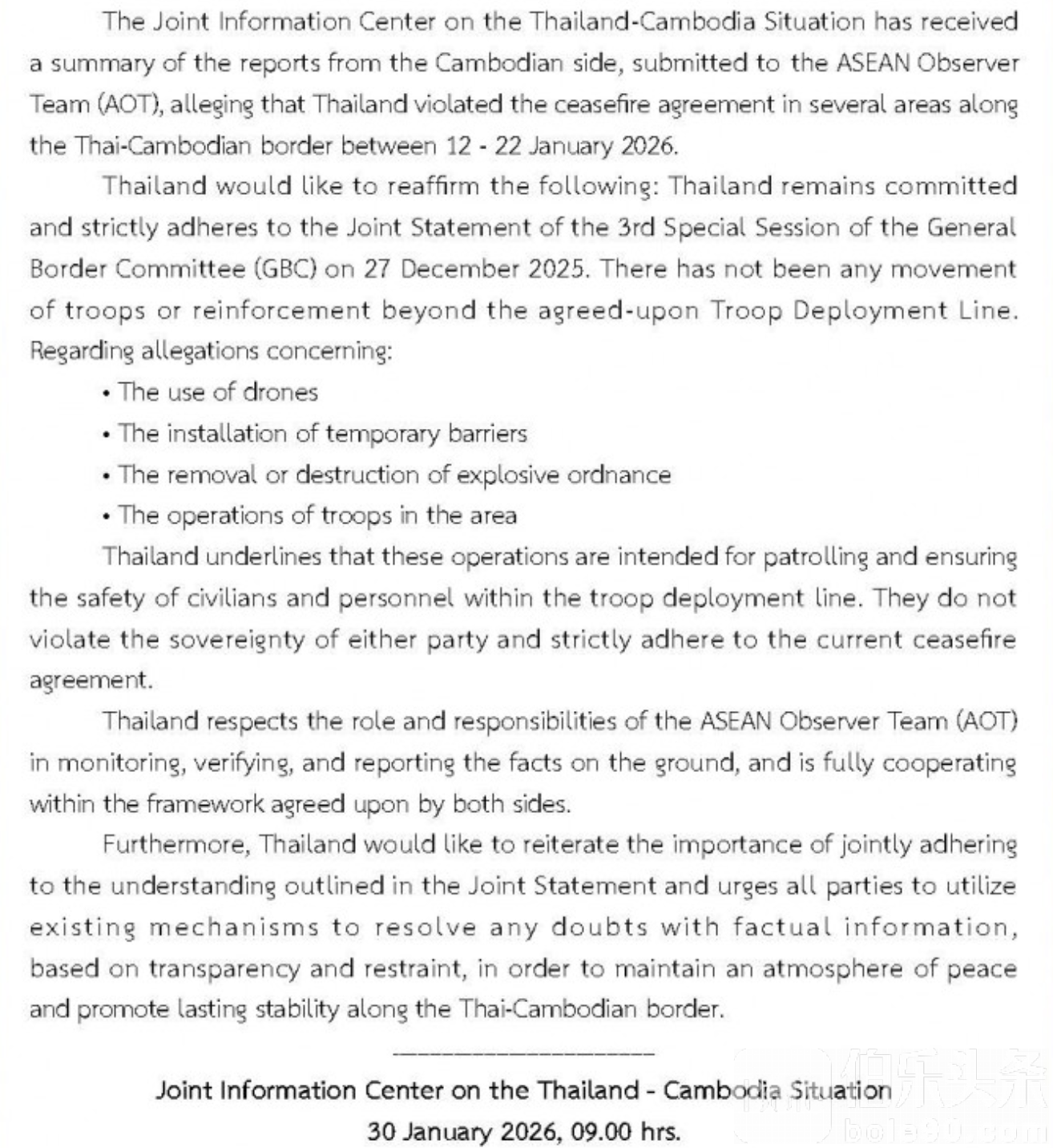 伯乐头条专讯:近日,针对柬埔寨方面向东盟观察团(ASEAN Observer Team, AOT)提出的“泰方违反停火协议”指控,泰国政府明确表示,该指控不属实,泰方在泰柬边境的所有行动均严格遵守双方先前签署的《联合声明》和《一般边界委员会》(GBC)特别会议第3次会议达成的安排。