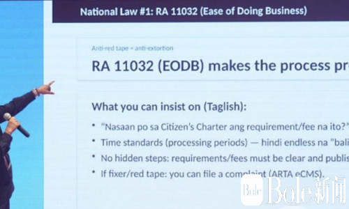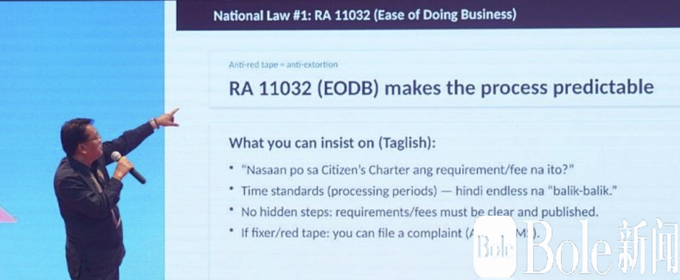 在法规讲解部分,他重点介绍了第11032号共和国法令——《简化商业流程法》。该法要求政府单位通过“公民宪章”公开办事流程、所需材料、费用标准、办理时限及投诉渠道,目的只有一个:把灰色空间压到最小。