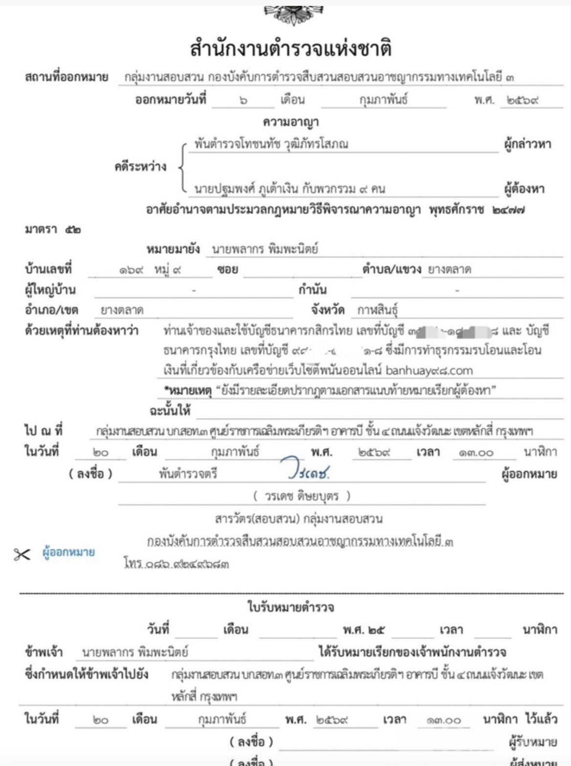 Bole新闻专讯:泰国网络犯罪调查警察于2月6日正式向加拉信府地方警署发函,要求转交传唤令给为泰党加拉信府第二区国会议员候选人“帕拉功·平帕尼”,要求其就涉嫌参与网络赌博网站及洗钱案件,于2月20日下午1时到位于曼谷政府综合大楼的网络犯罪调查第三分局接受调查。