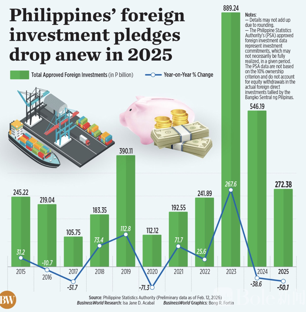 Bole新闻专讯:菲律宾统计局最新数据显示,2025年批准的外商投资金额锐减50.1%,降至2,723.8亿比索,为五年来最大跌幅。这一数字不仅低于2024年的5,461.9亿比索,也创下自2022年以来的新低,显示投资者对菲律宾经济前景的谨慎情绪正在加剧。