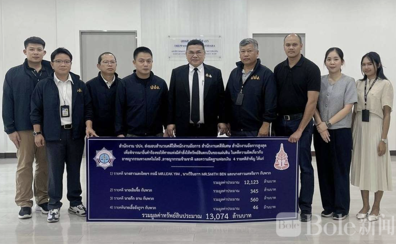 Bole新闻专讯:泰国反洗钱体系正式向跨国网络诈骗集团亮剑。2月17日,泰国反洗钱办公室宣布,已将4起涉及跨国电诈、网络赌博与洗钱的大案正式移交给特别检察署,请求法院裁定将总价值超过130.74亿泰铢的涉案资产充公归国家所有。这批资产涵盖豪宅、土地、豪华公寓、跑车、游艇、现金及银行账户,被视为近年来泰国针对跨国诈骗集团最重磅的一次财产打击行动。