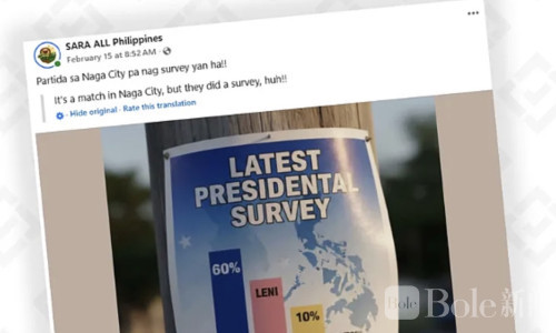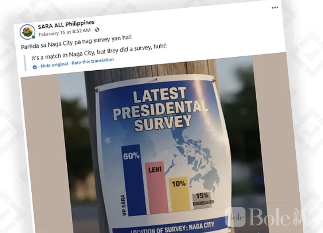 Bole新闻专讯:近日,一张显示副总统Sara Duterte在2028年总统大选民调中以60%支持率大幅领先的图片在菲律宾社交平台疯传,引发热议。不过,经多家媒体与技术工具核查,这张“高光民调图”并非真实数据,而是由人工智能生成的虚假内容。
