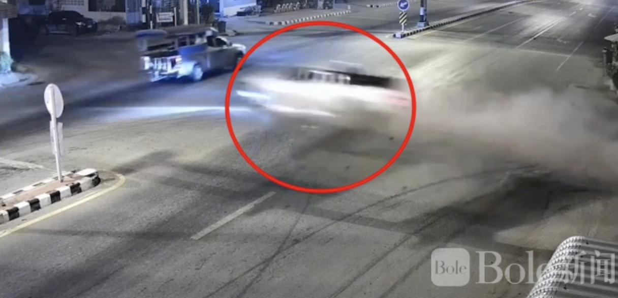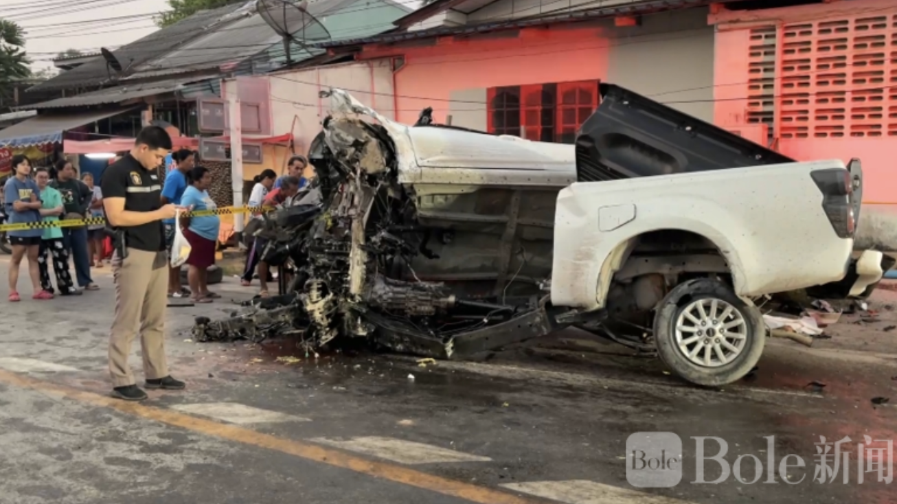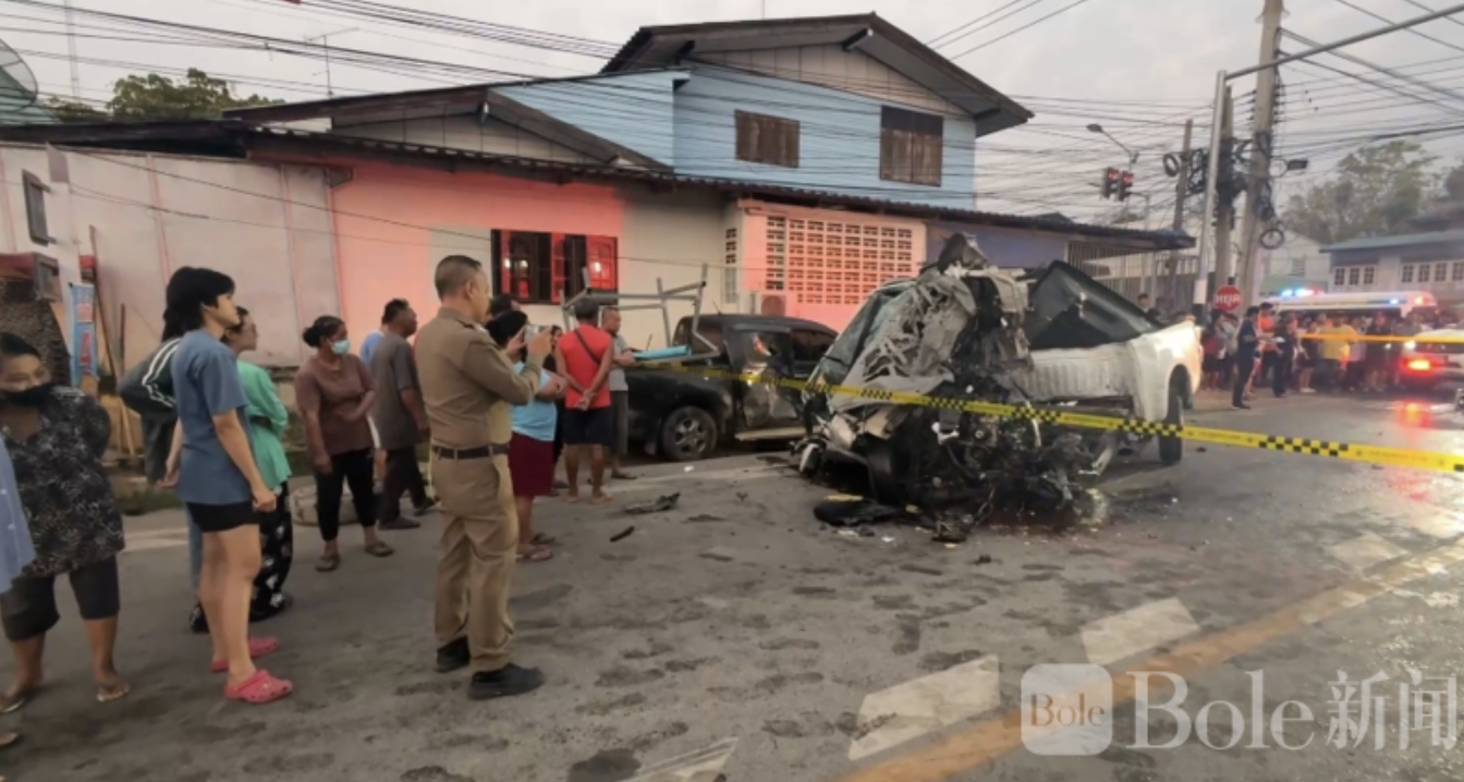 Bole新闻专讯:2026年2月22日清晨5时30分左右,泰国猜纳府色卡武里县发生一起重大交通事故。一辆皮卡高速闯红灯,在红绿灯路口连续撞击多辆车辆并冲上电线杆,造成严重伤亡。截至目前,事故已导致5人死亡、4人重伤,现场一度惨不忍睹。