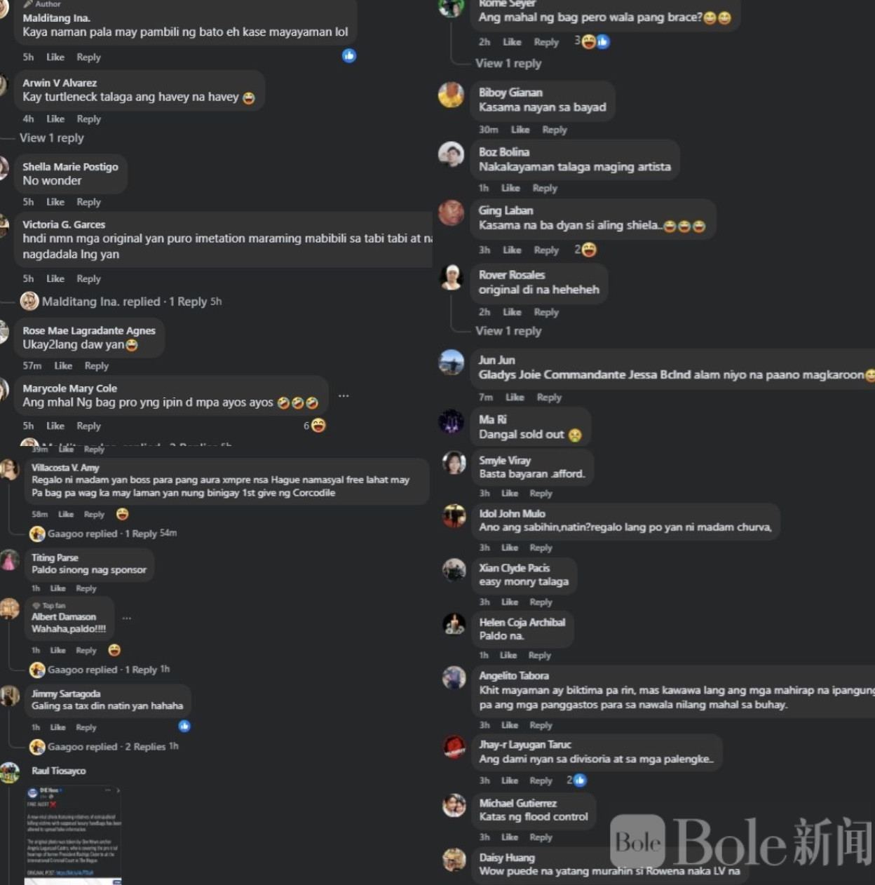 有趣的是,这些造假图片甚至被转发至与ICC或政治无关的群组,包括Shopee购物群、TikTok折扣群以及公立学校教师群体,扩大了传播范围。评论区则充斥着讥讽和质疑,菲律宾中部方言中“paldo”(意指突然变富)成为热词,网友们还调侃这些家属是“毒品战争的富二代”,讽刺其“欧洲之旅是税金资助”。