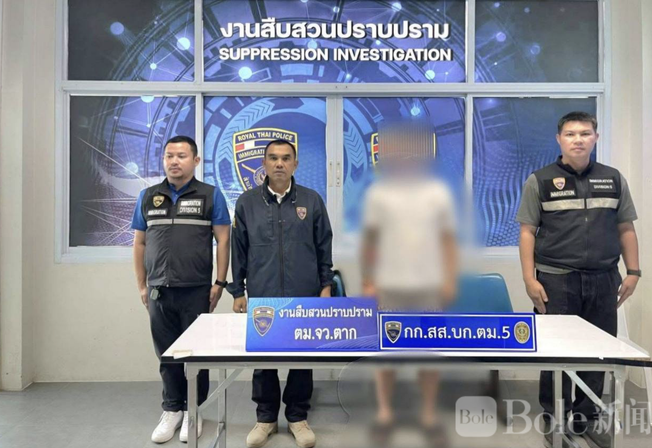 Bole新闻专讯:2026年2月27日上午约9时,泰国达府移民局侦查预防打击部门联合移民局第五分局展开针对外籍人员违规滞留的专项执法行动,在达府移民局办公室逮捕一名中国籍男子。