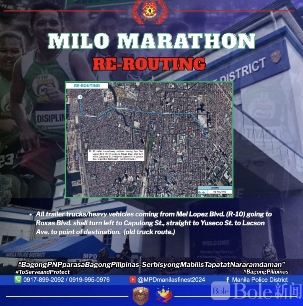 Bole新闻专讯:马尼拉警方近日宣布,为配合3月1日举办的大型马拉松赛事,市区多条主要道路将从凌晨1:30开始临时封闭,届时交通将实施改道措施,民众出行需提前规划。受影响的区域包括罗哈斯大道、博尼法西奥大道、P. Burgos大街、琼斯桥,以及内城(Intramuros)和黎刹公园周边街道。