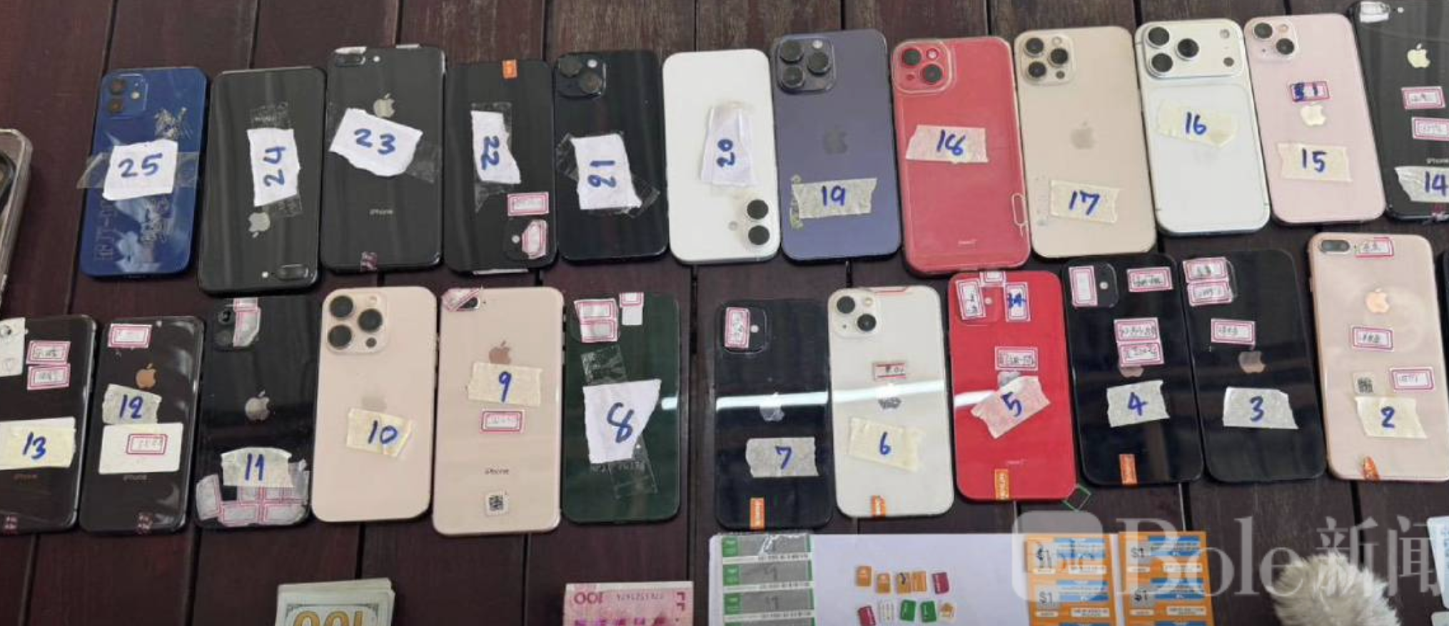 警方随后在车内起获多项物证,包括:各型号AppleiPhone手机25部、手机SIM卡10张、充值卡1张、面额100美元纸币55张(约合17.1万泰铢)、面额100元人民币1张