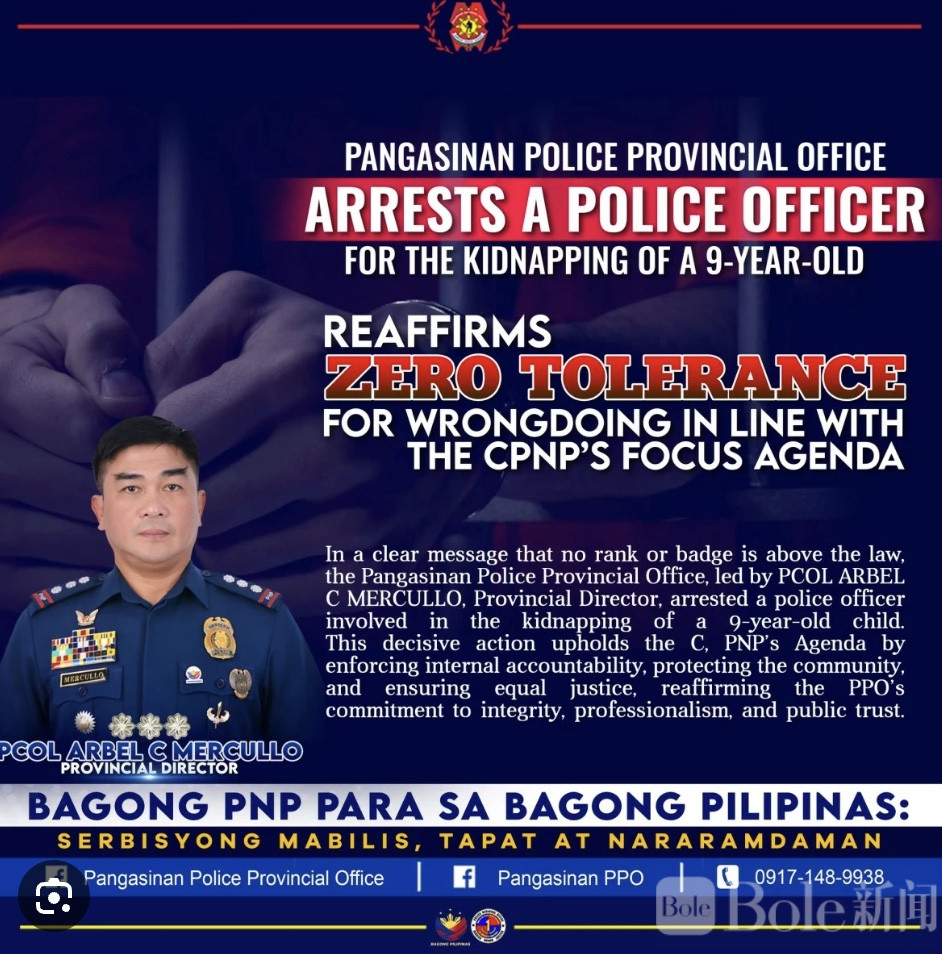Bole新闻专讯:菲律宾一名现役警察因涉嫌绑架一名9岁女童,于2月26日在邦阿西楠省被警方逮捕,目前已被拘押,案件已移送检察机关进一步处理。消息一出,在当地社会引发不小震动——毕竟,涉案人员的身份本应是守护者。