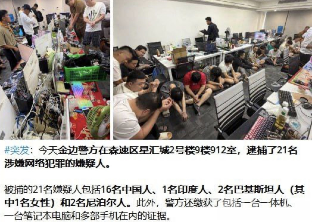 据悉,2月25日下午,在金边警察局长尊那林指挥部署下,警方重点突查了星汇城2号楼9层的912室、910室,以及4号楼822室,当场控制21名网络诈骗犯罪嫌疑人。其中16人为中国籍,另外5人包括2名尼泊尔人、2名巴基斯坦人和1名印度人。