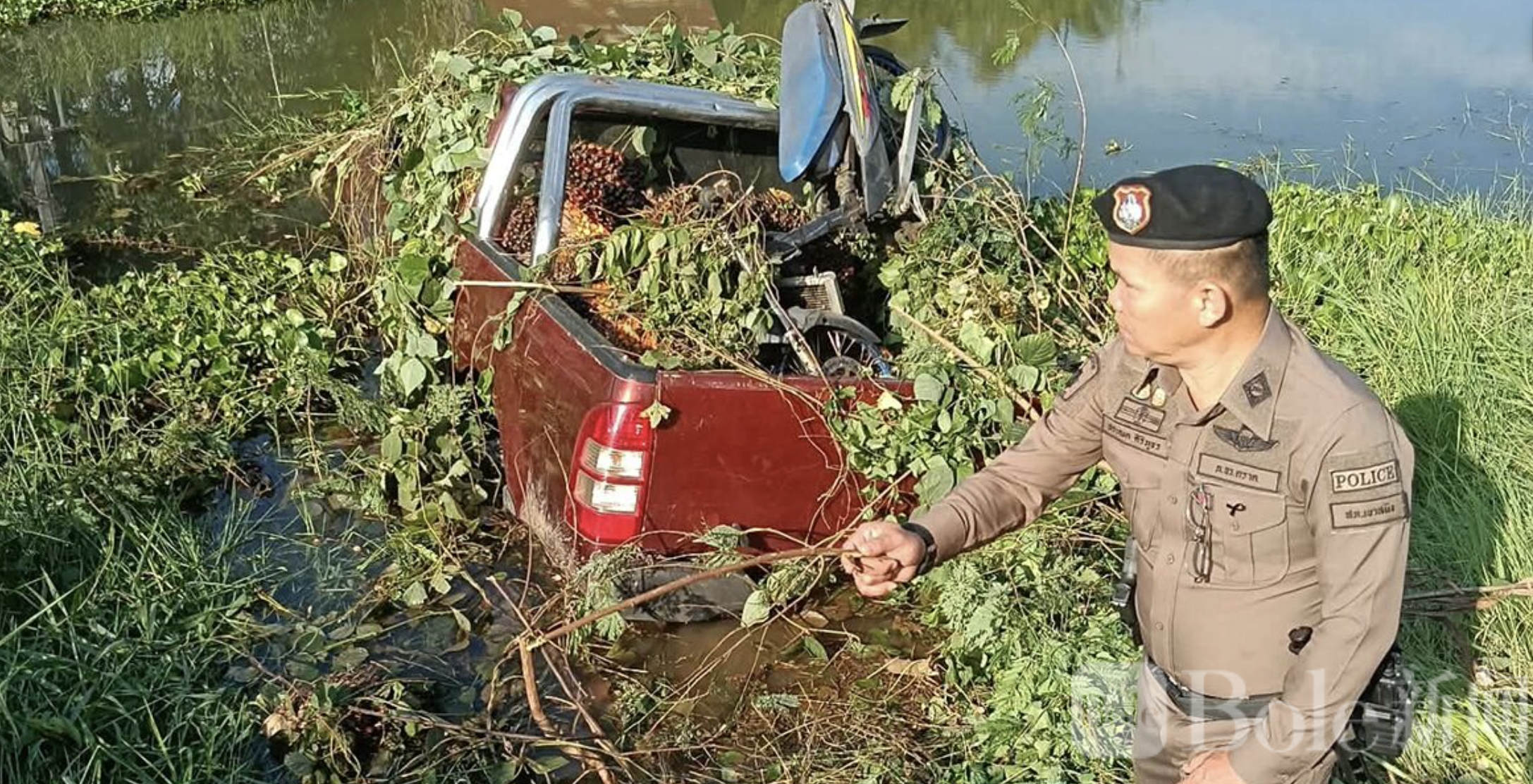 Bole新闻专讯: 3月10日下午15:30,泰国达叻府考善明区发生一起惊险交通事故,一辆载有棕榈果的红色福特皮卡失控翻入望河运河。事故发生后,司机立即逃离现场,并要求好心市民不要报警。