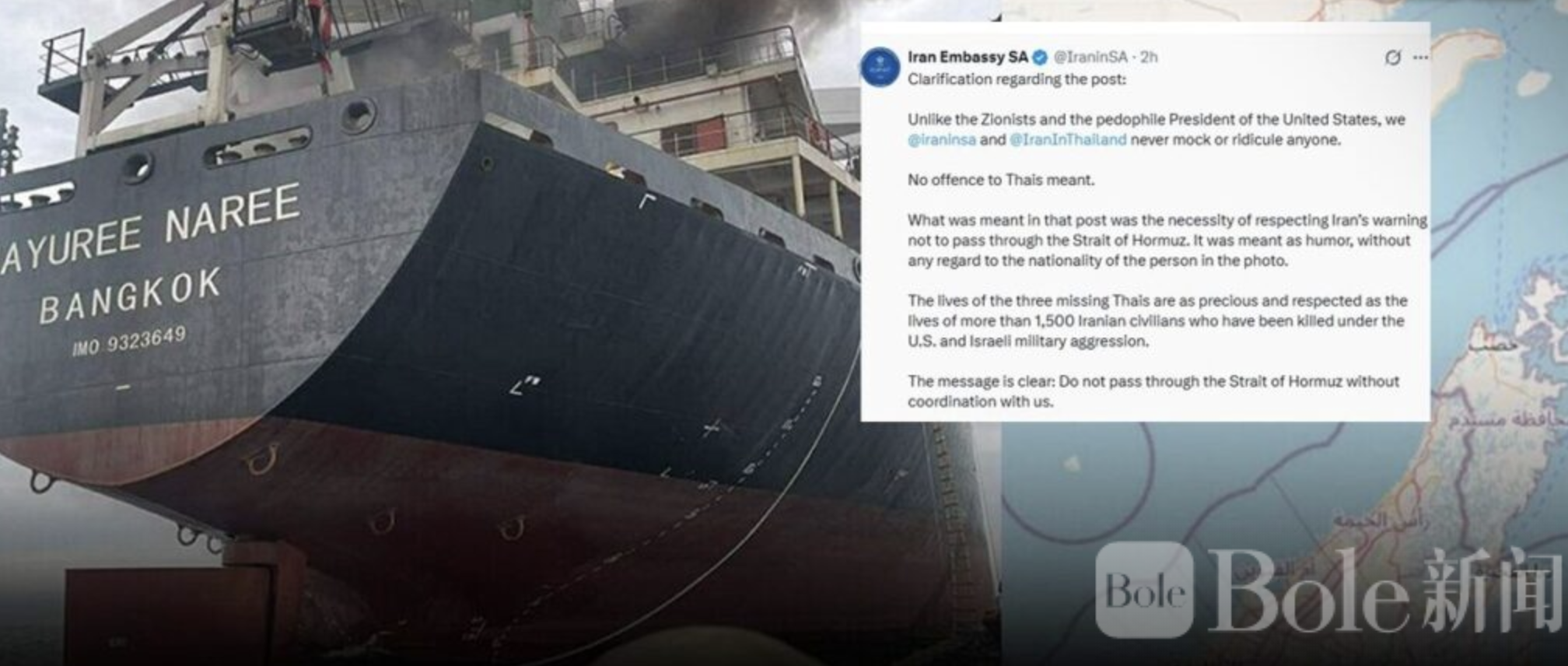 Bole新闻专讯: 泰国货船“Mayuree Naree”号此前在霍尔木兹海峡遭袭事件仍在发酵,一则来自伊朗外交机构的社交媒体帖文近日引发广泛争议。部分泰国网友认为该帖文带有嘲笑意味,在网络上迅速掀起讨论。