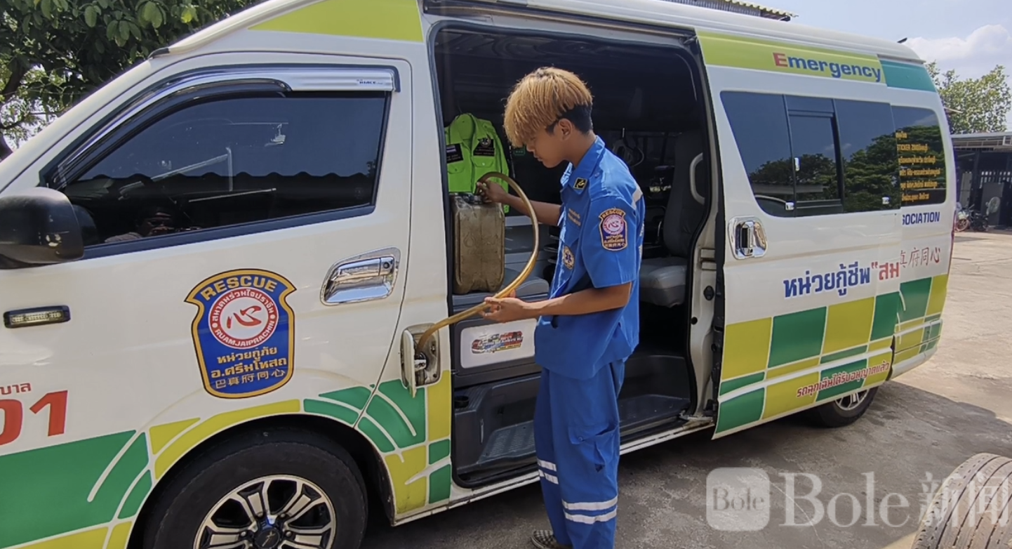 Bole新闻专讯: 泰国普拉钦府科克皮布区近日爆发严重油荒,一辆志愿救护车在执行救护任务途中因柴油用尽被迫停在路上,车内仍有患者,情势紧急。
