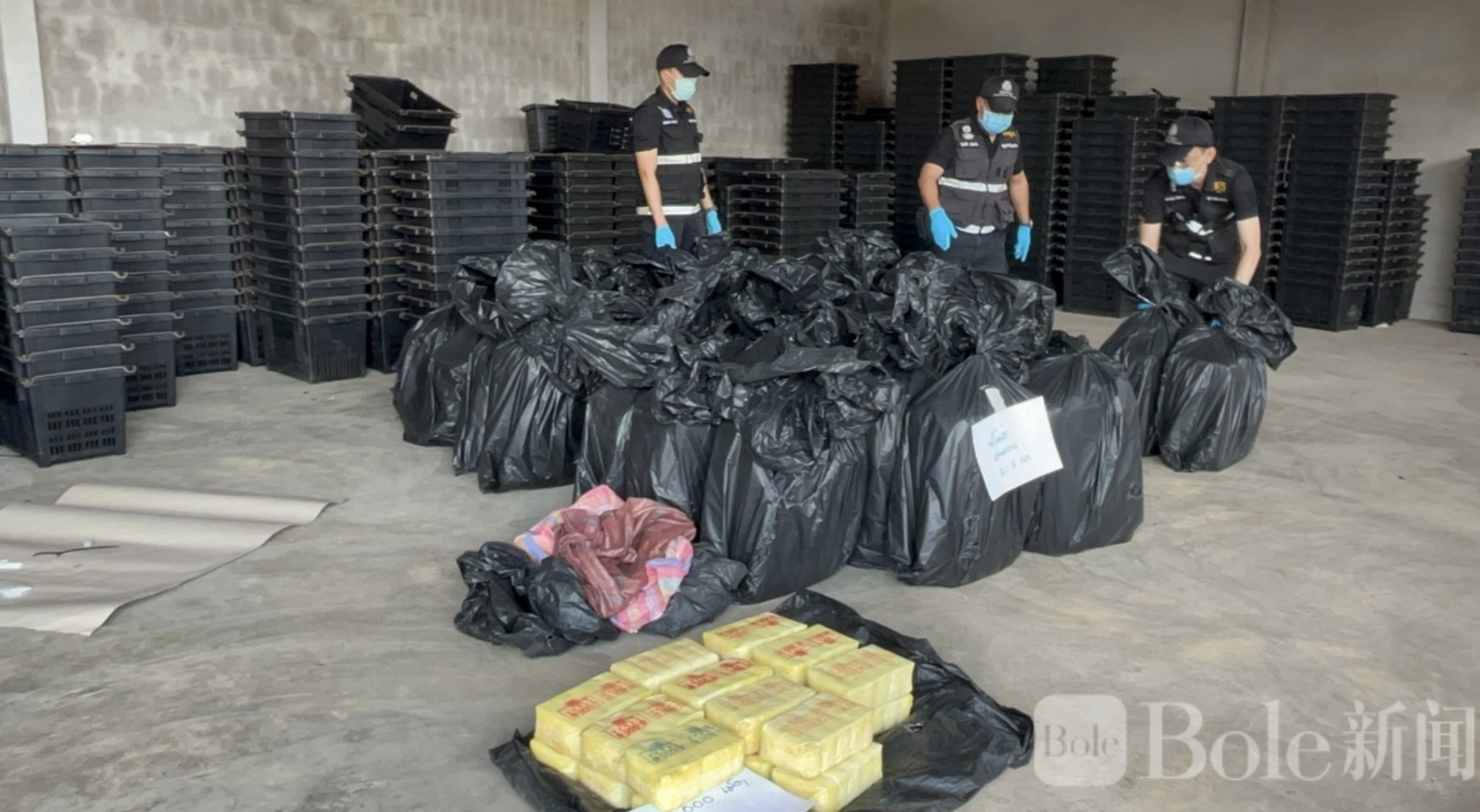 Bole新闻专讯:泰国帕府警方近日在一处出租仓库内查获大规模毒品案件,共缴获约800万粒冰毒(俗称“疯药”),毒品被以多重方式层层伪装,并通过黑色塑料袋、塑料箱打孔堆叠等方式隐藏,同时现场还发现GPS追踪设备。