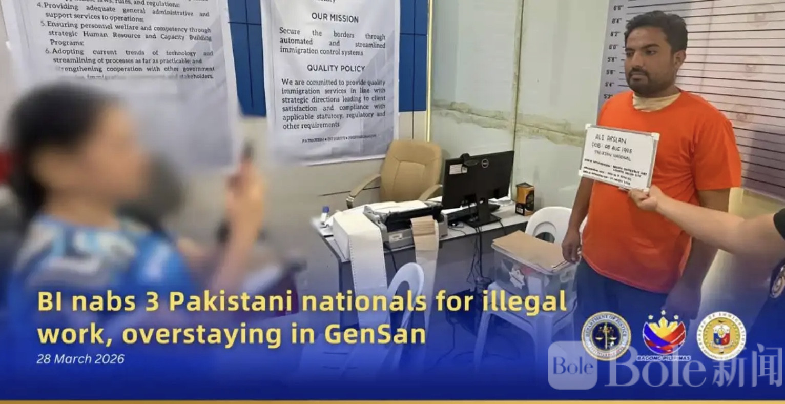 Bole新闻专讯:菲律宾移民局近日在南部城市将军市展开执法行动,抓获3名涉嫌违反移民法规的巴基斯坦籍男子。执法人员称,这几人不仅存在签证问题,还被发现直接参与商业经营活动,目前已被带走接受进一步调查。