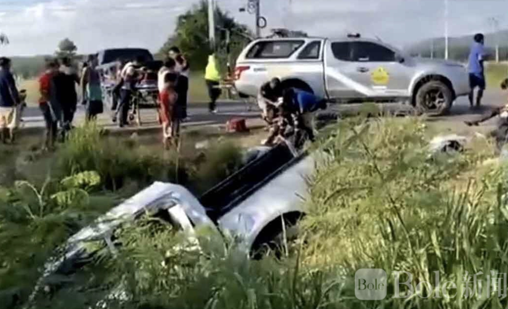 Bole新闻专讯:泰国雷阳省尼克姆帕塔纳区3月29日发生一起严重车祸,一辆载有7名缅甸劳工的白色皮卡与一辆黑色皮卡在交叉路口迎面相撞,现场瞬间陷入混乱,造成9人受伤,其中包括3名伤势严重的缅甸劳工。
