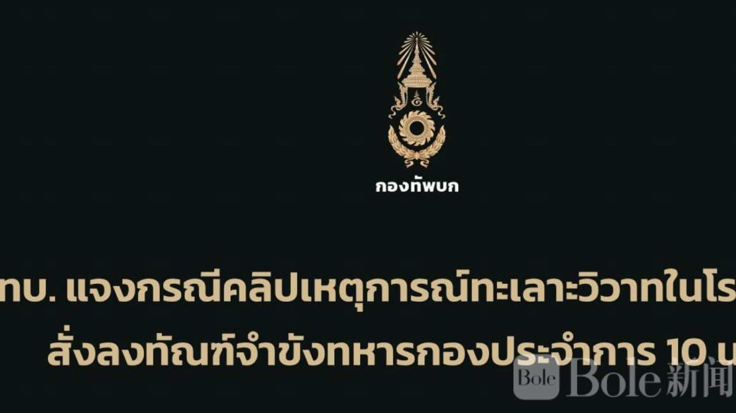 Bole新闻专讯:泰国军方近日就一段在社交媒体上流传的“军营宿舍打架”视频作出回应。军方调查确认,视频中的冲突事件发生于2026年3月27日,地点位于泰国巴蜀府的他那叻军营(隶属预备役力量中心)。事件源于几名义务兵之间的私人矛盾,情绪失控之下演变为拳脚相向的群体冲突。